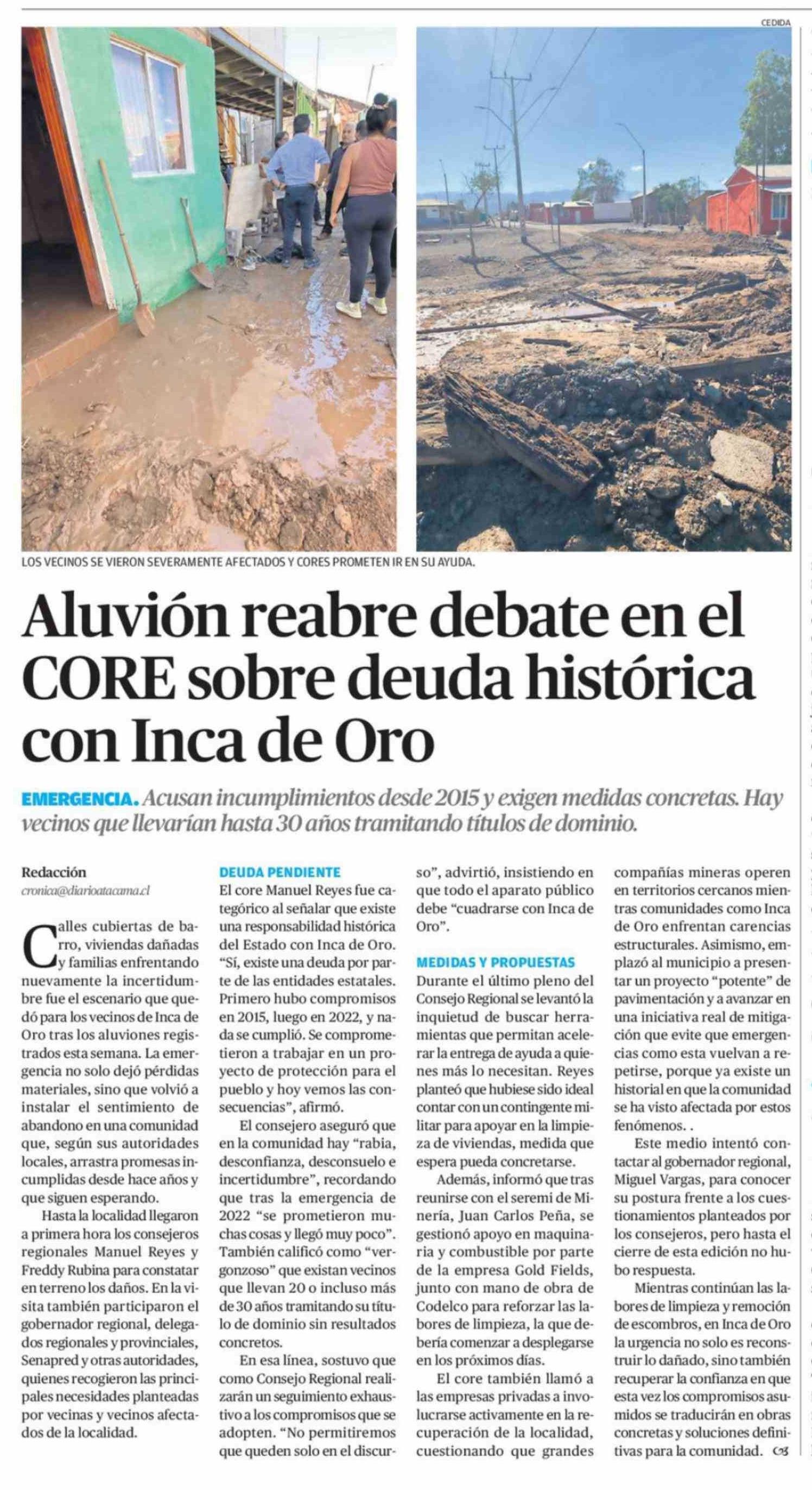 Aluvión reabre debate en el CORE sobre deuda histórica con Inca de Oro