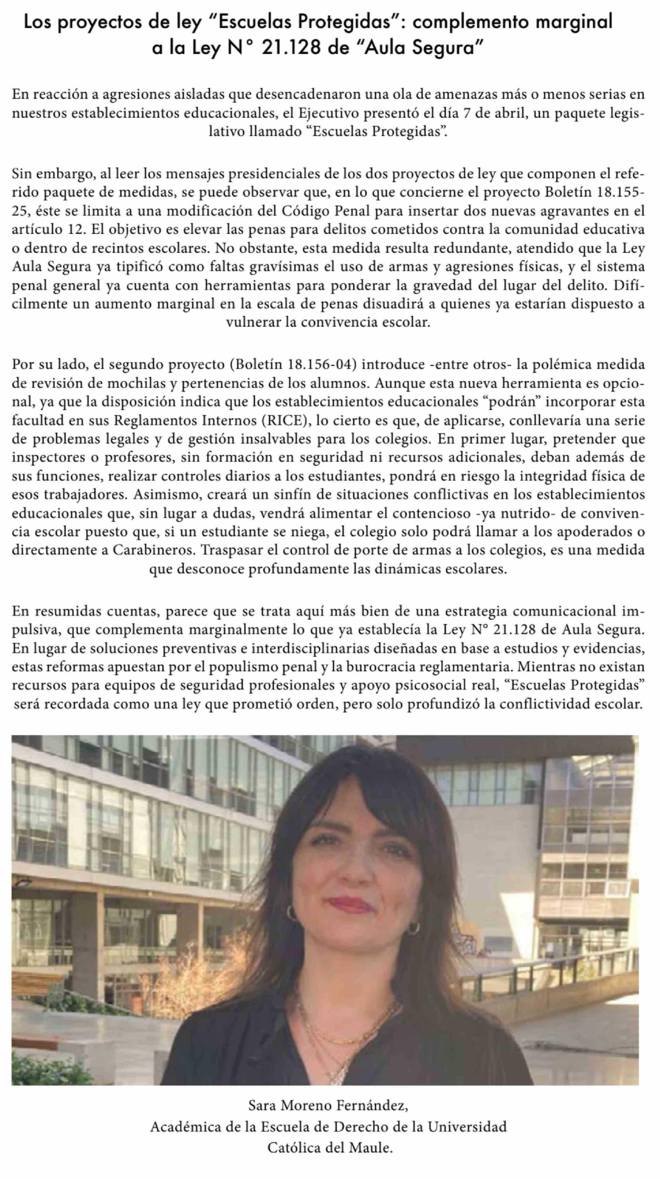 Título: Columnas de Opinión: En reacción a agresiones aisladas que desencadenaron una ola de amenazas más o menos serias en nuestros establecimientos educacionales, el Ejecutivo presentó el día 7 de abril, un paquete legislativo llamado "Escuelas Protegidas".