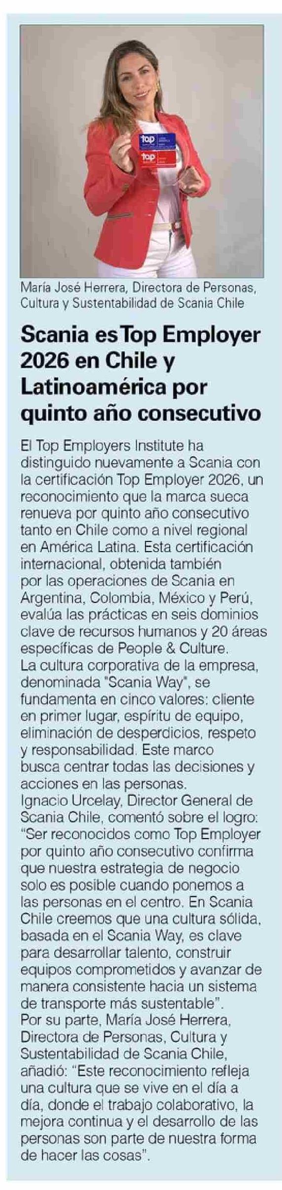 Scania es Top Employer 2026 en Chile y Latinoamérica por quinto año consecutivo