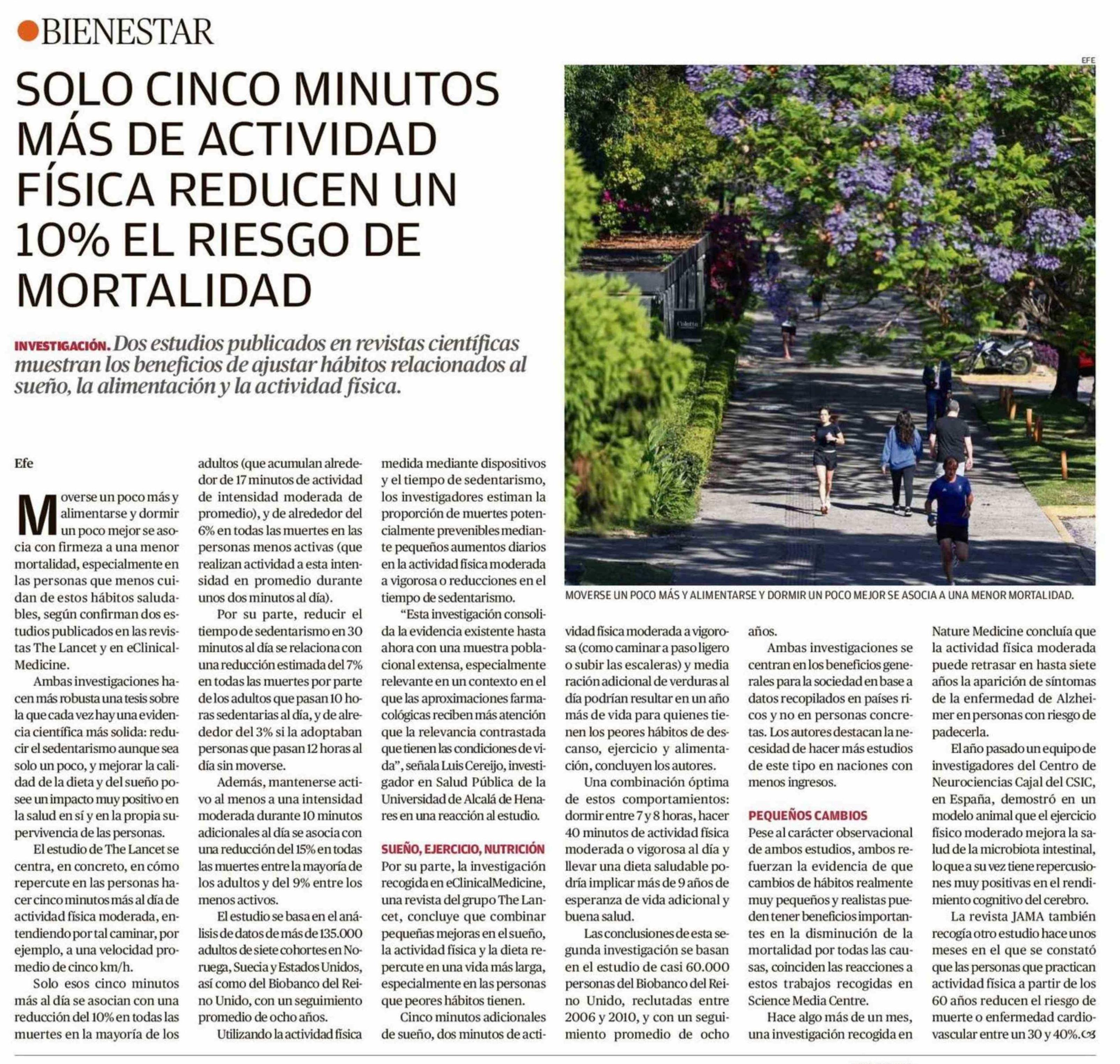SOLO CINCO MINUTOS MÁS DE ACTIVIDAD FÍSICA REDUCEN UN 10% EL RIESGO DE MORTALIDAD