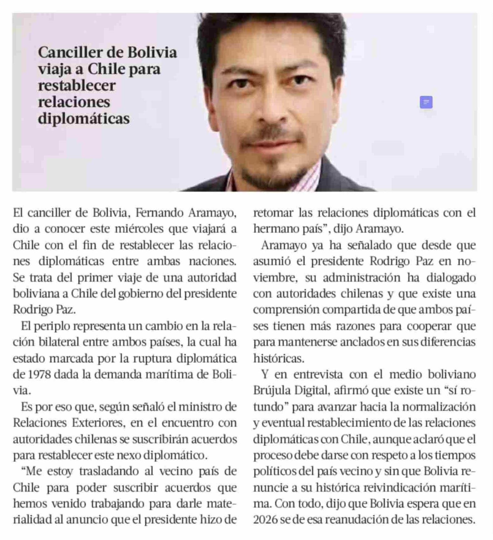 Canciller de Bolivia viaja a Chile para restablecer relaciones diplomáticas