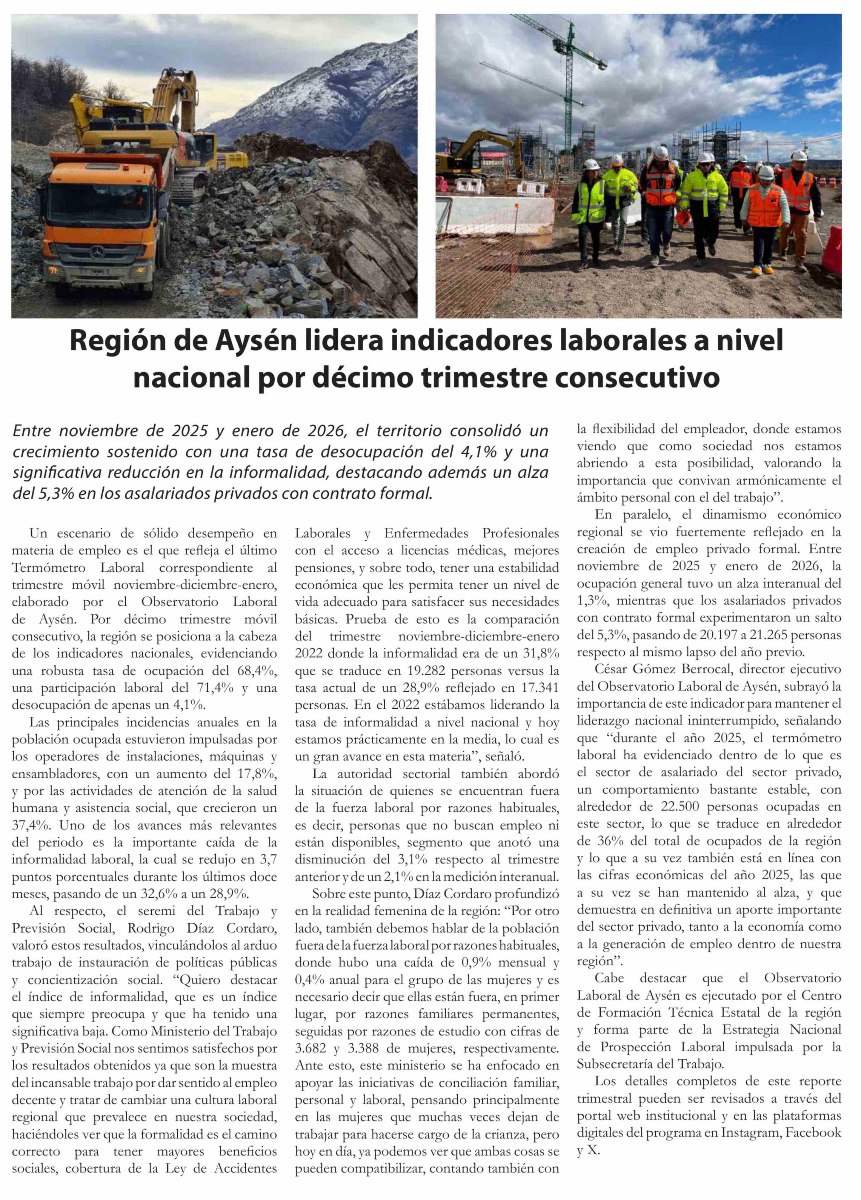 Región de Aysén lidera indicadores laborales a nivel nacional por décimo trimestre consecutivo