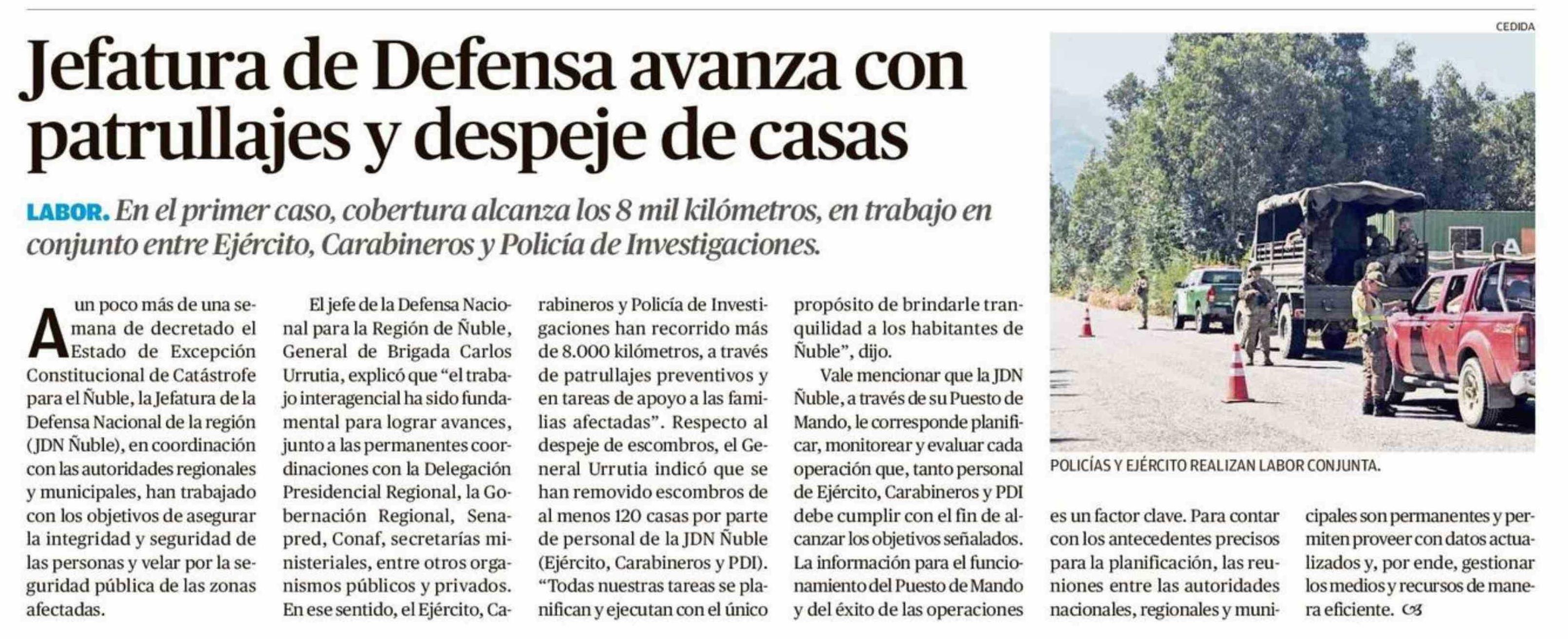 Jefatura de Defensa avanza con patrullajes y despeje de casas
