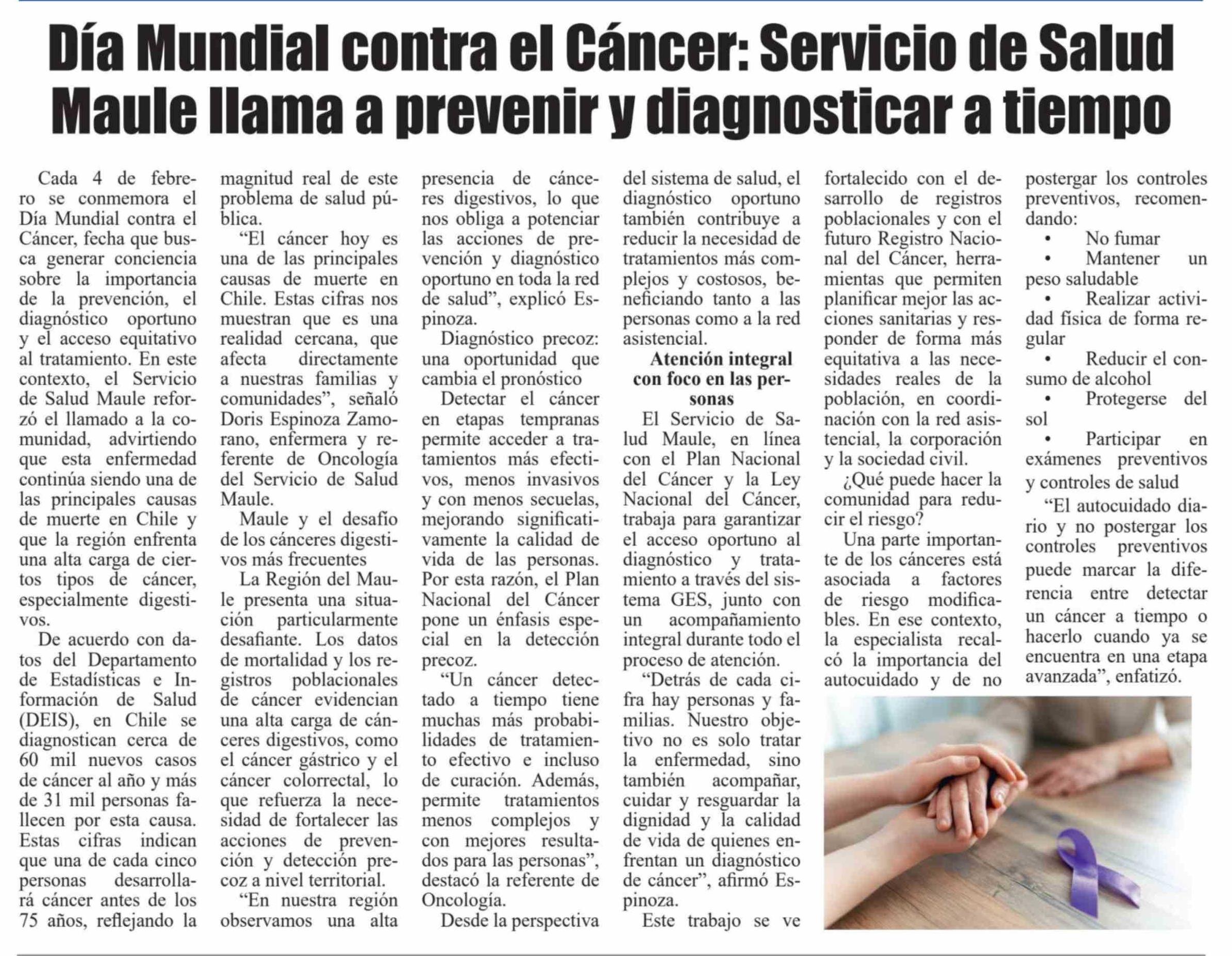 Día Mundial contra el Cáncer: Servicio de Salud Maule llama a prevenir y diagnosticar a tiempo