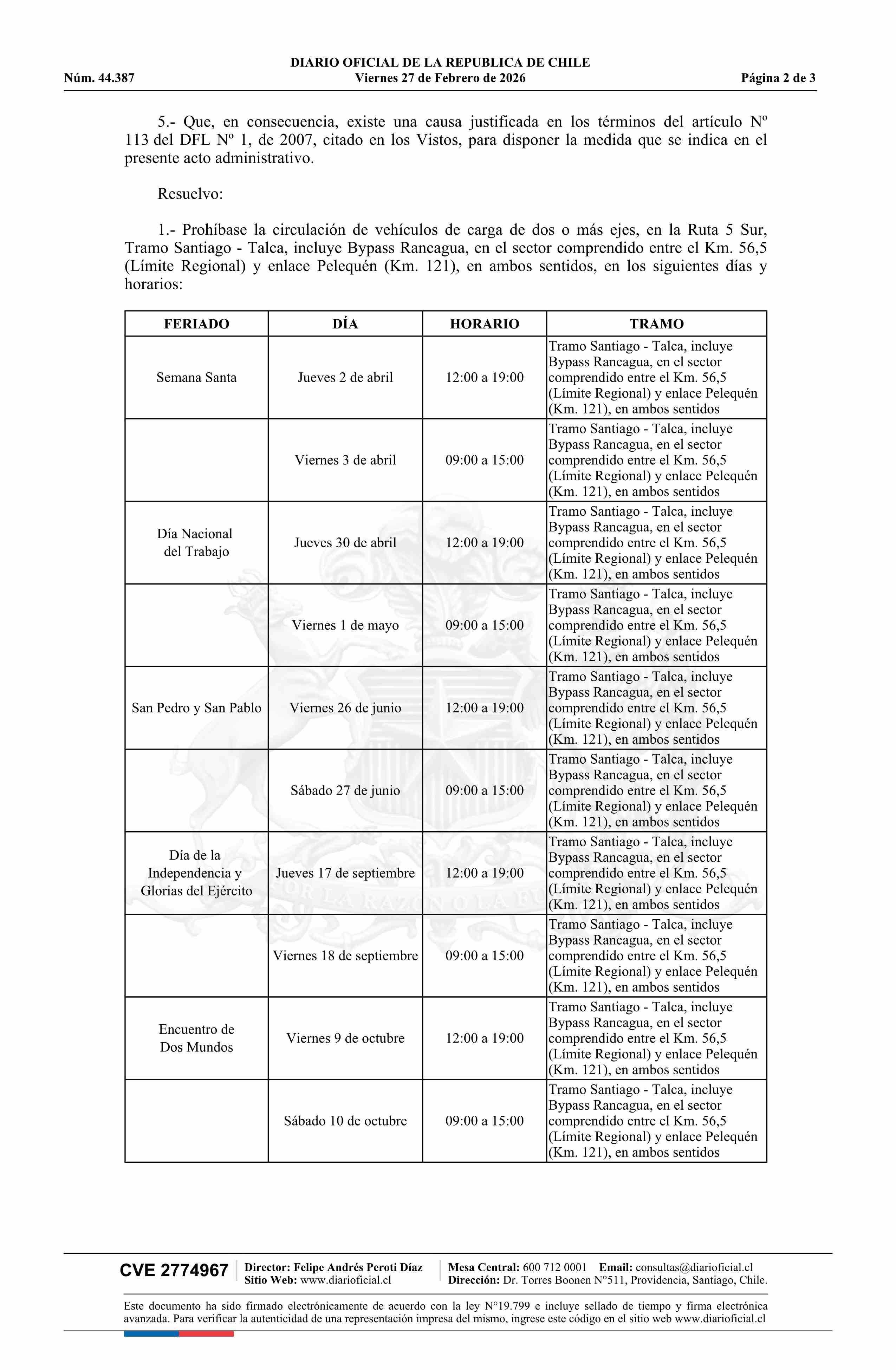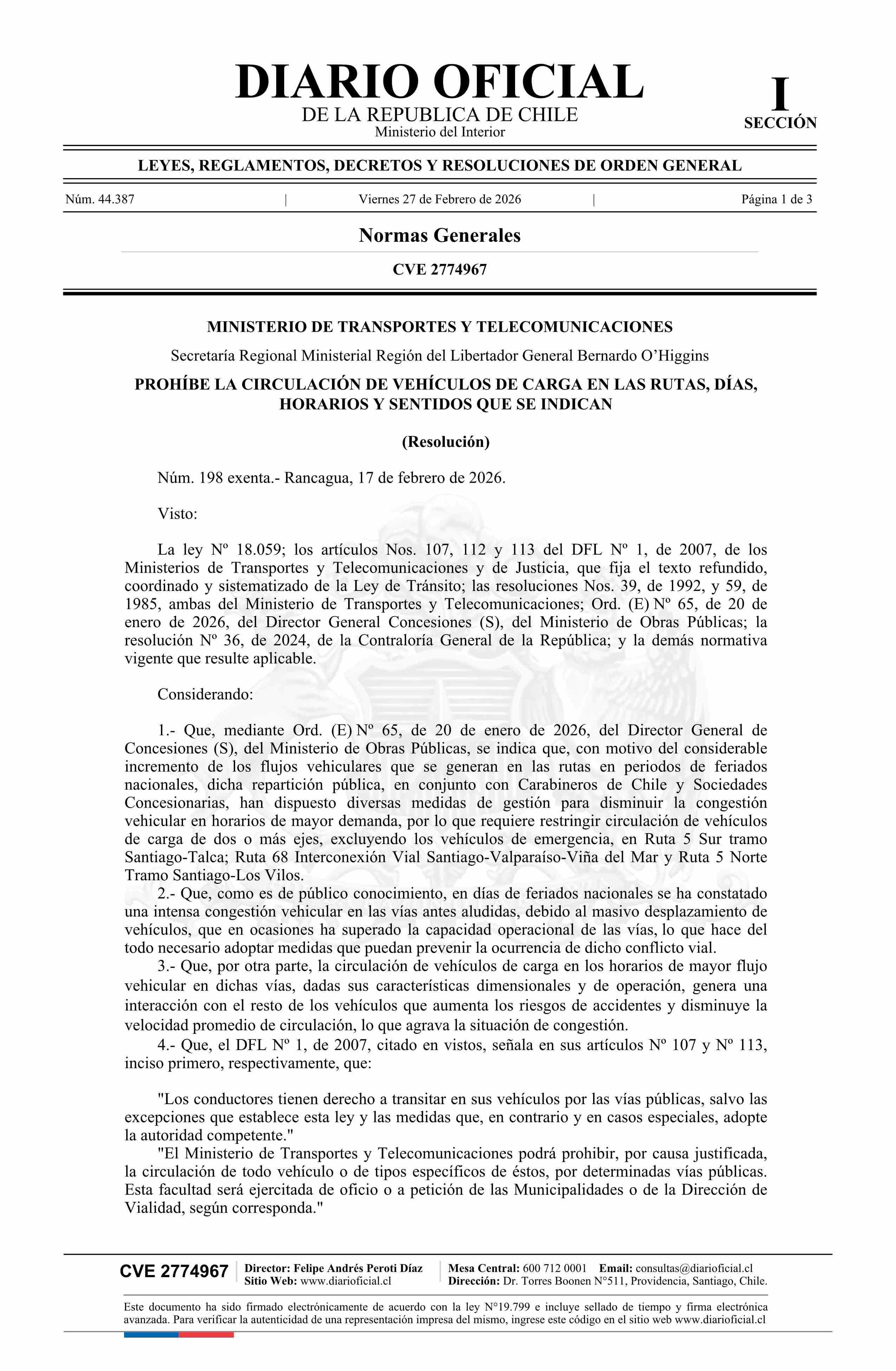 | Título: | Resolución exenta número 198, de 2026.- Prohíbe la circulación de vehículos de carga en rutas, días, horarios y sentidos que indica |