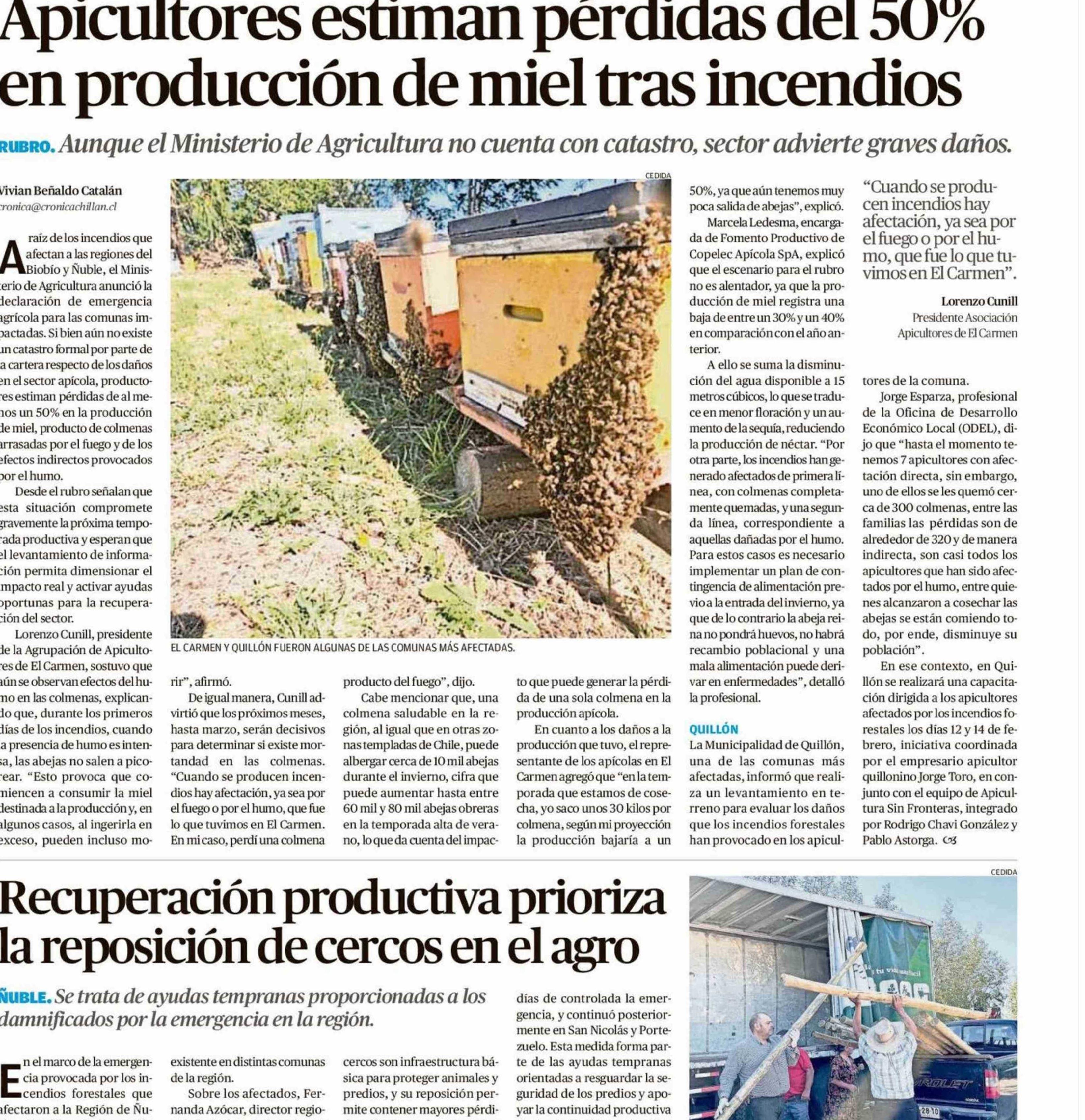 Apicultores estiman pérdidas del 50% en producción de miel tras incendios
