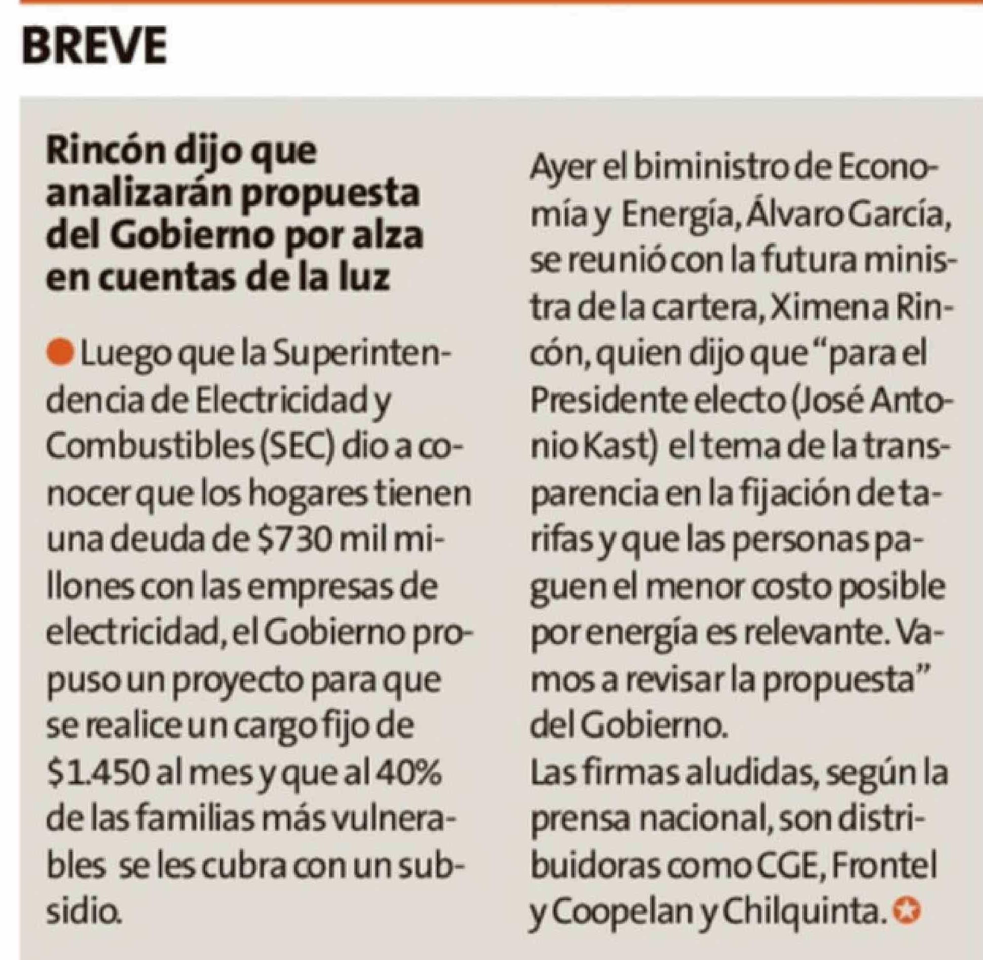 Título: BREVE Rincón dijo que Ayer el biministro de Econoanalizarán propuesta mía y Energía, Álvaro García, del Gobierno por alza se reunió con la futura minisen cuentas de la luz tra de la cartera, Ximena Rin· Luego que la Superintencón, quien dijo que "para el dencia de Electricidad y Presidente electo (J