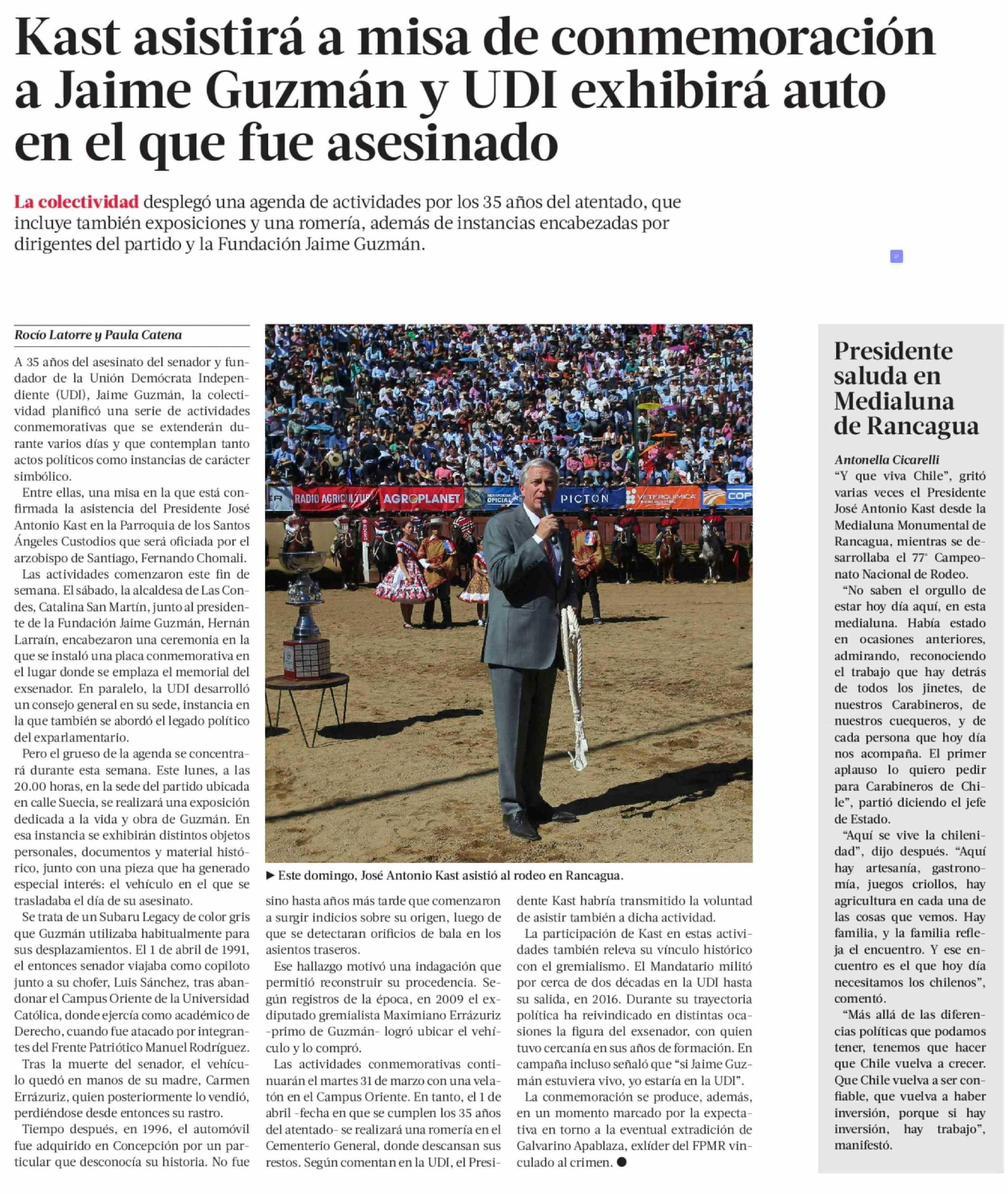 Título: Kast asistirá a misa de conmemoración a Jaime Guzmán y UDI exhibirá auto en el que fue asesinado