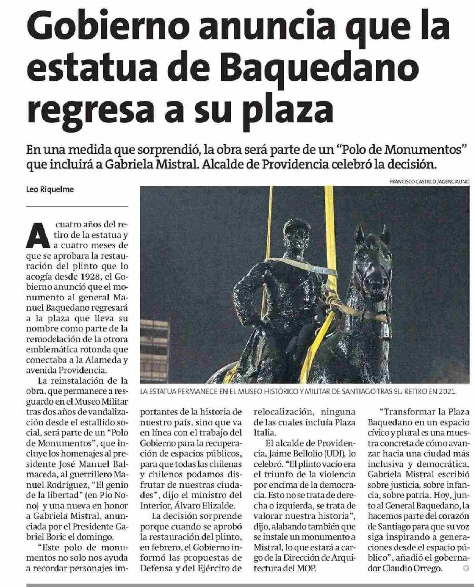 Gobierno anuncia que la estatua de Baquedano regresa a su plaza