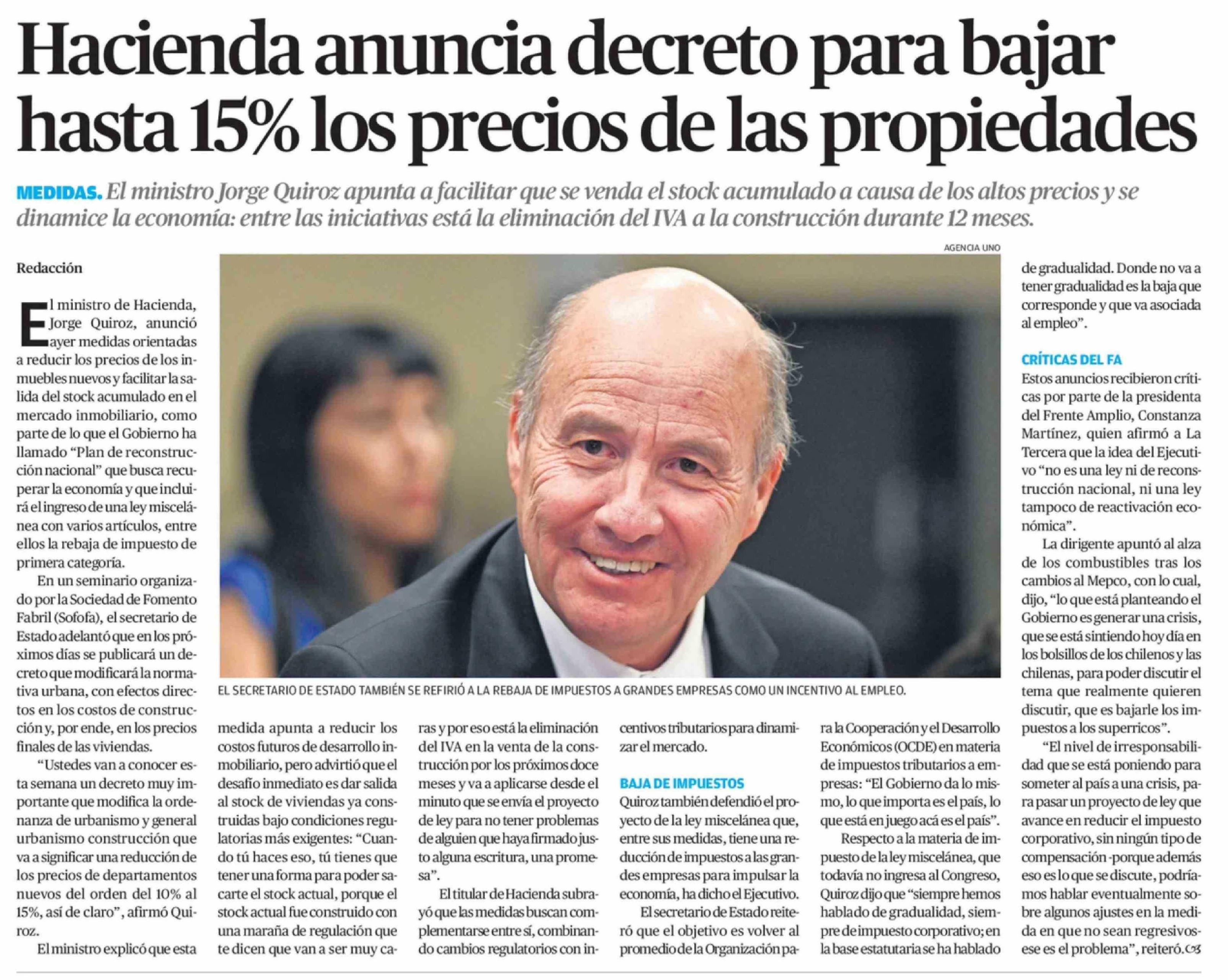 Hacienda anuncia decreto para bajar hasta 15% los precios de las propiedades