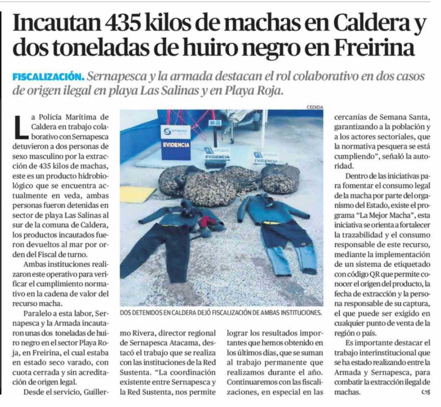Incautan 435 kilos de machas en Caldera y dos toneladas de huiro negro en Freirina