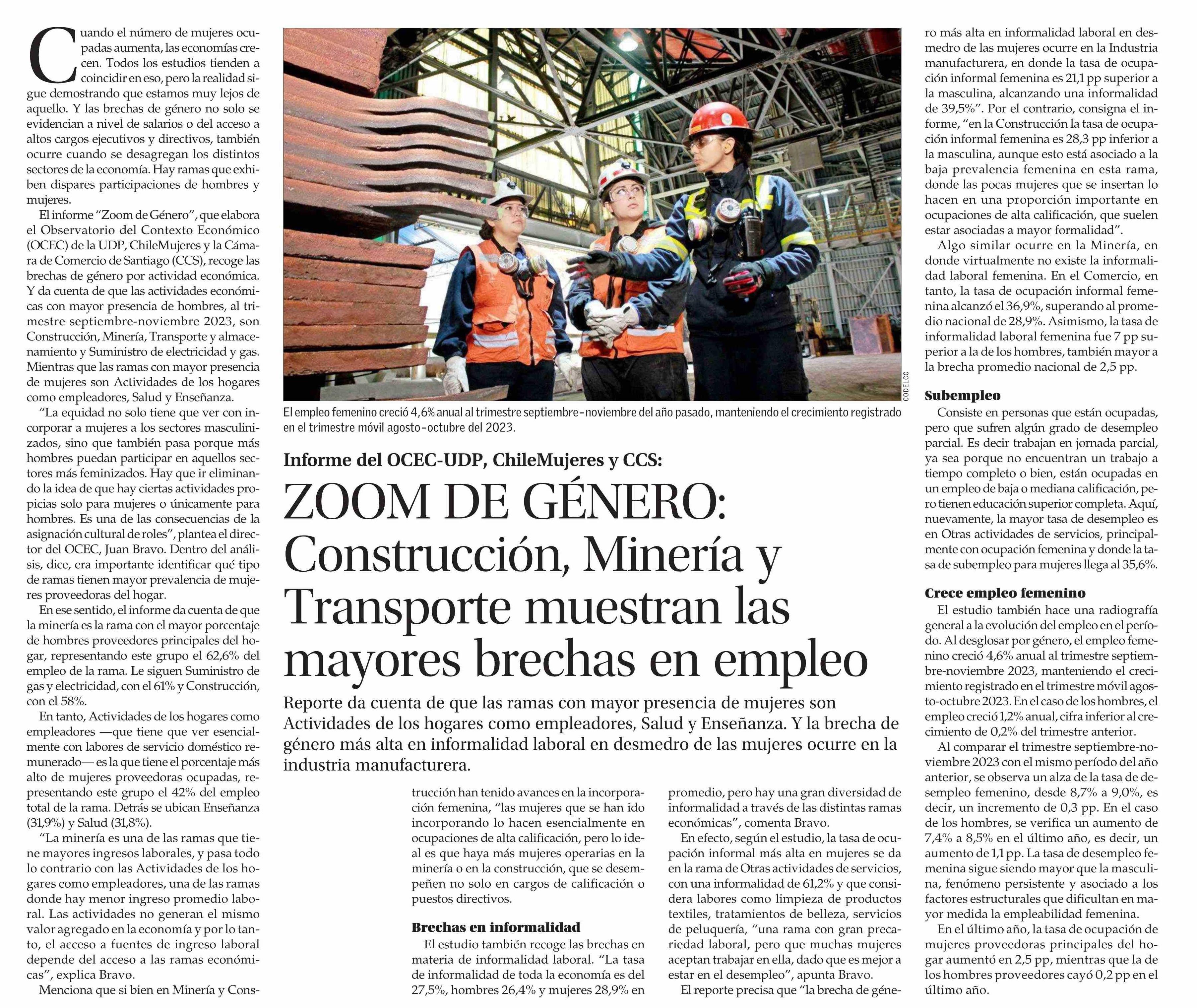 ZOOM DE GENERO: Construcción, Minería y Transporte muestran las mayores brechas en empleo