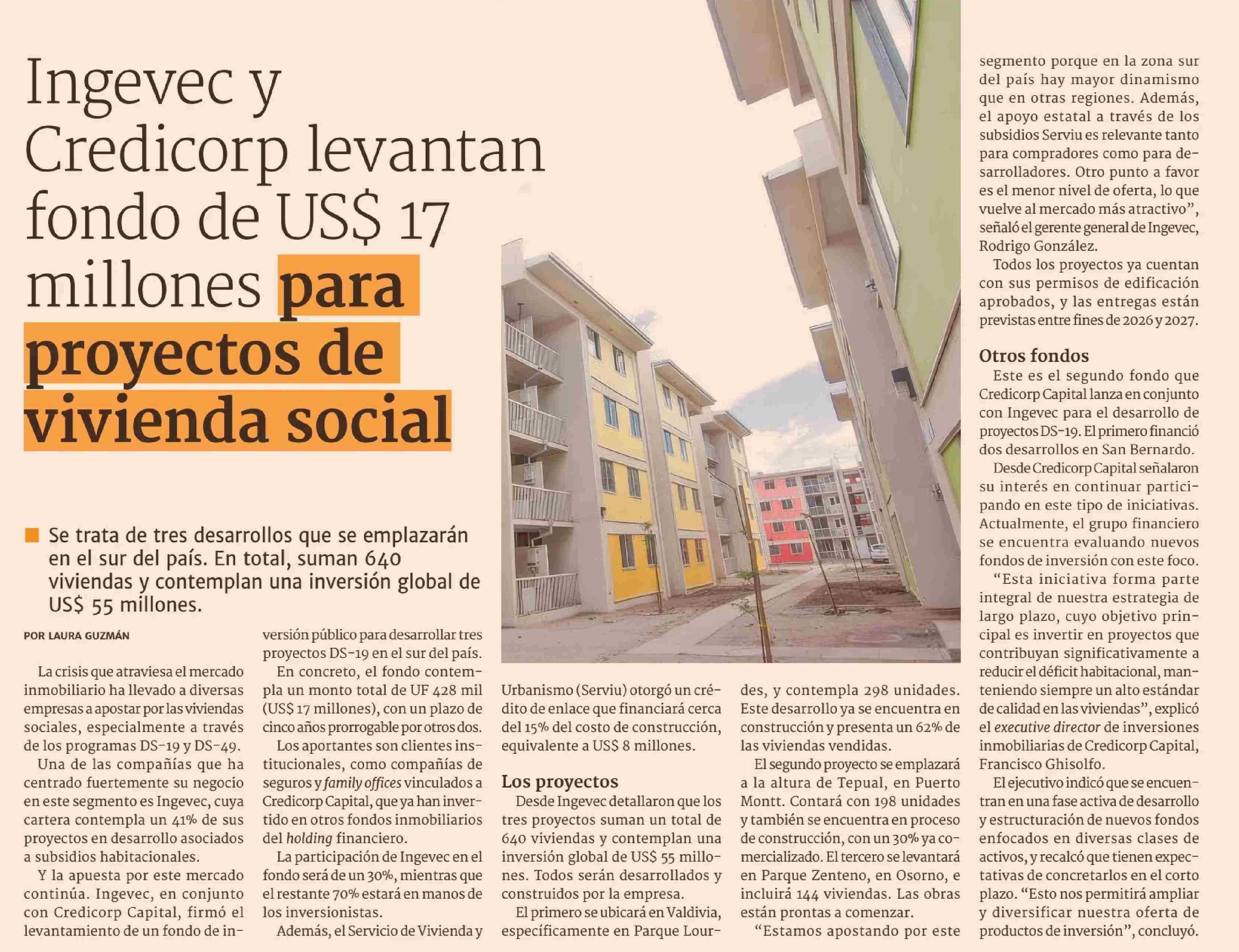Ingevec y Credicorp levantan fondo de USS 17 millones Para proyectos de vivienda social