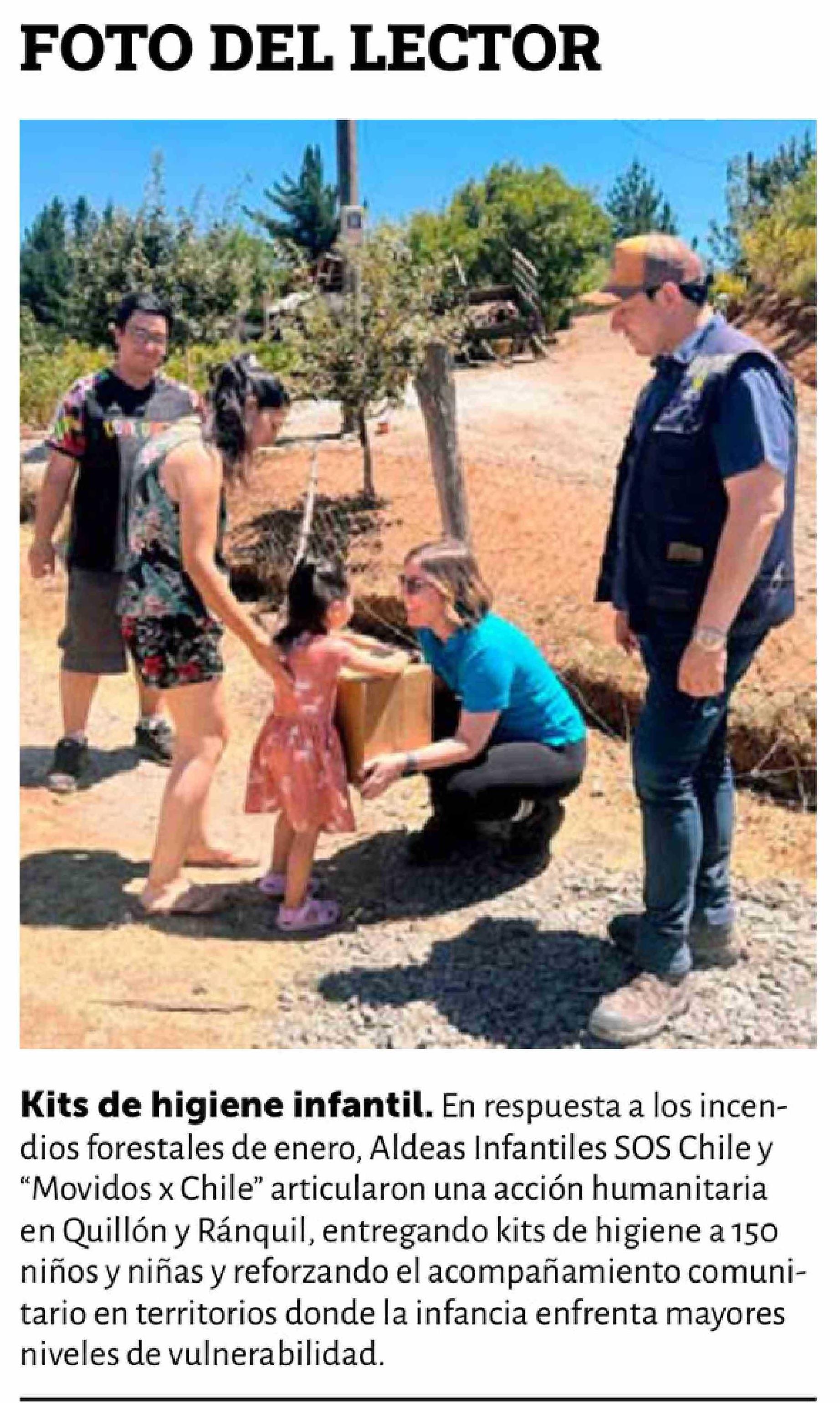 | Título: | Kits de higiene infantil. En respuesta a los incendios forestales de enero, Aldeas Infantiles SOS Chile y "Movidos x Chile" articularon una acción humanitaria en Quillón y Ránquil, entregando kits de higiene a 150 niños y niñas y reforzando el acompañamiento comunitario en territorios donde la infan |