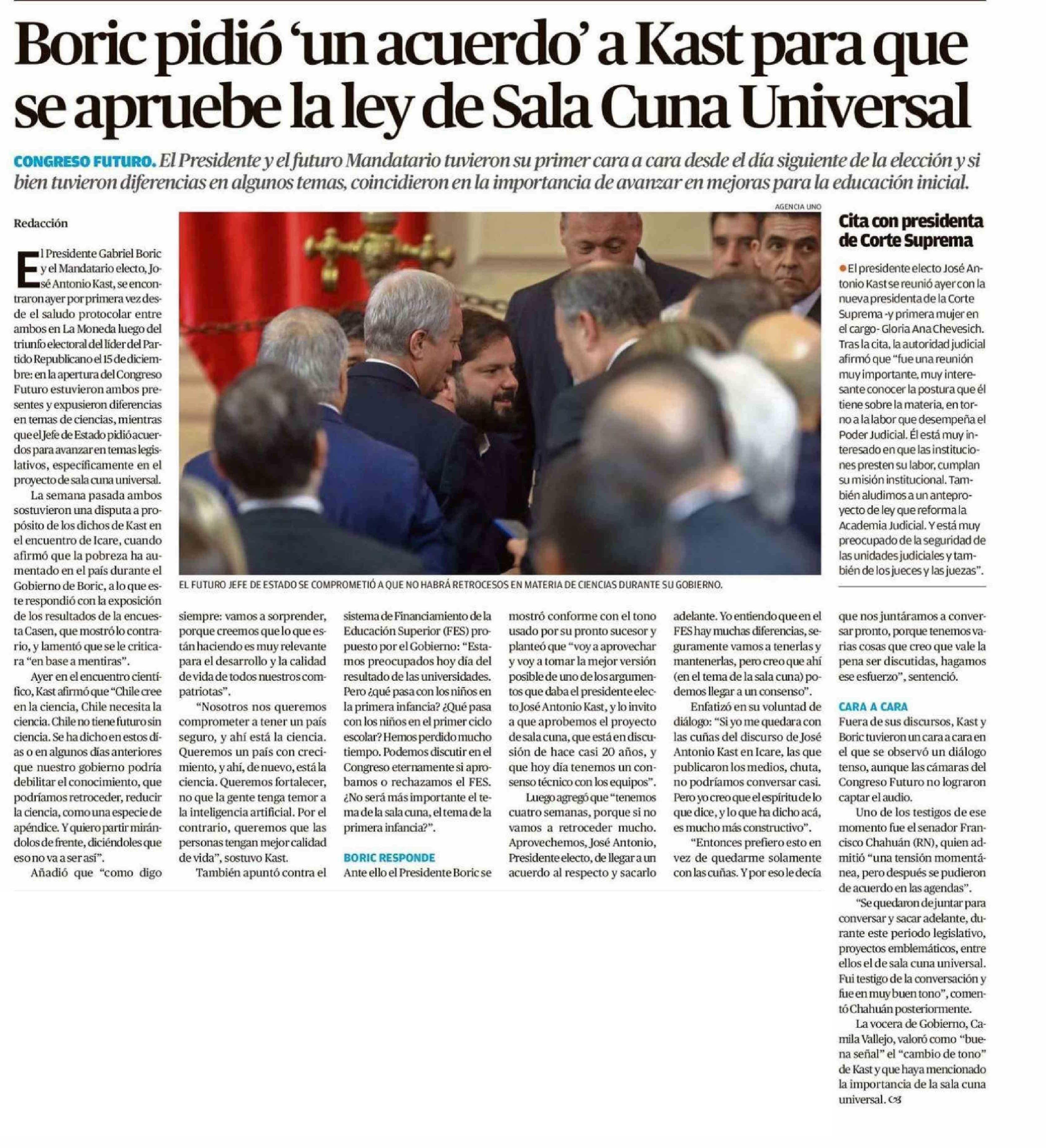 Boric pidió "un acuerdo' a Kast para que se apruebe la ley de Sala Cuna Universal