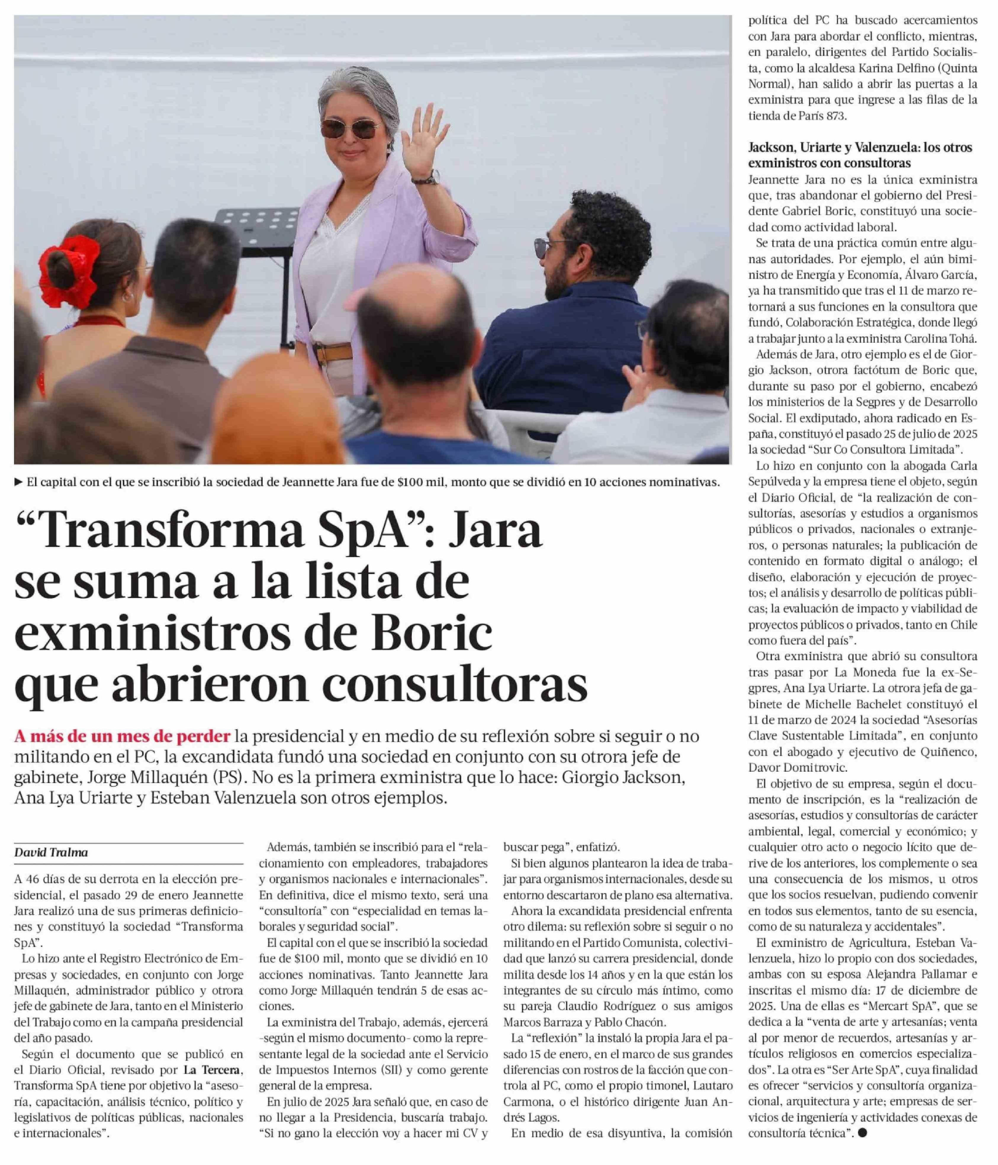 Título: "Transforma SpA": Jara se suma a la lista de exministros de Boric que abrieron consultoras