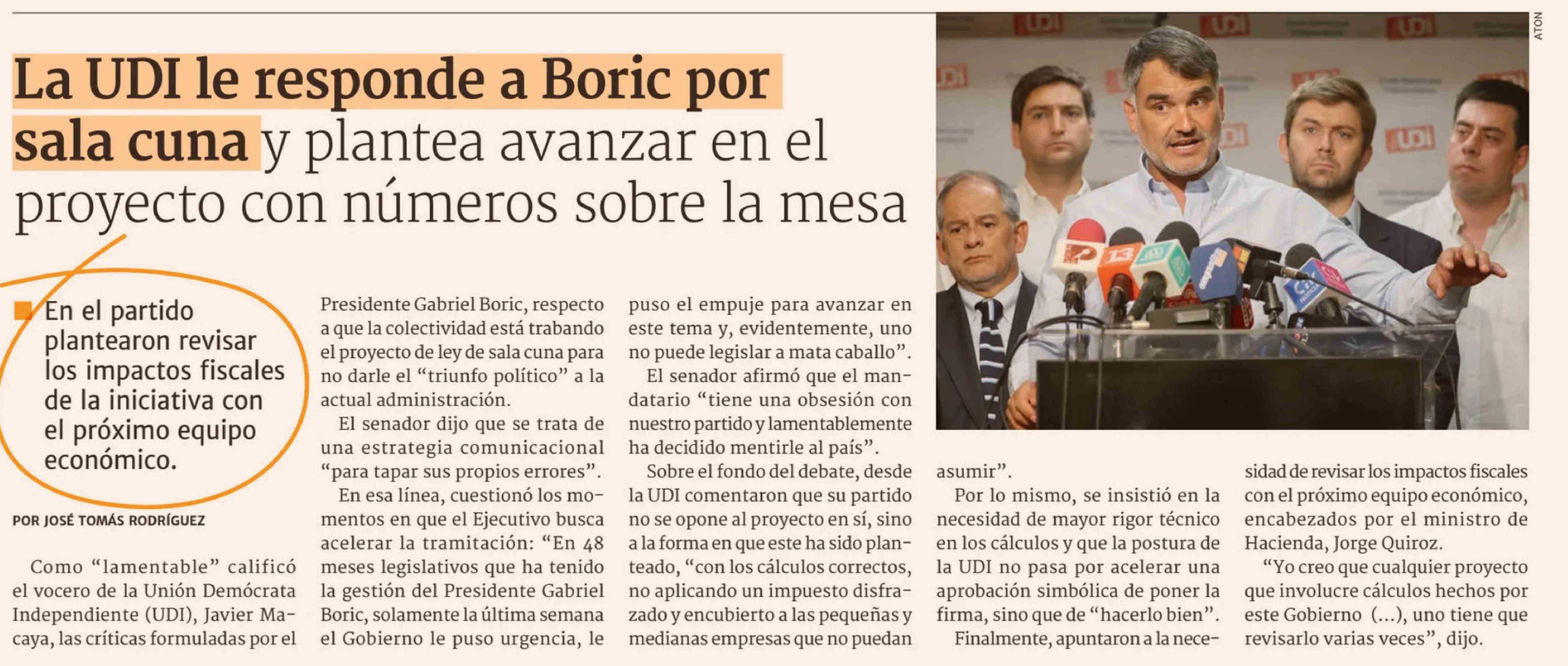 La UDI le responde a Boric por sala cuna y plantea avanzar en el proyecto con números sobre la mesa