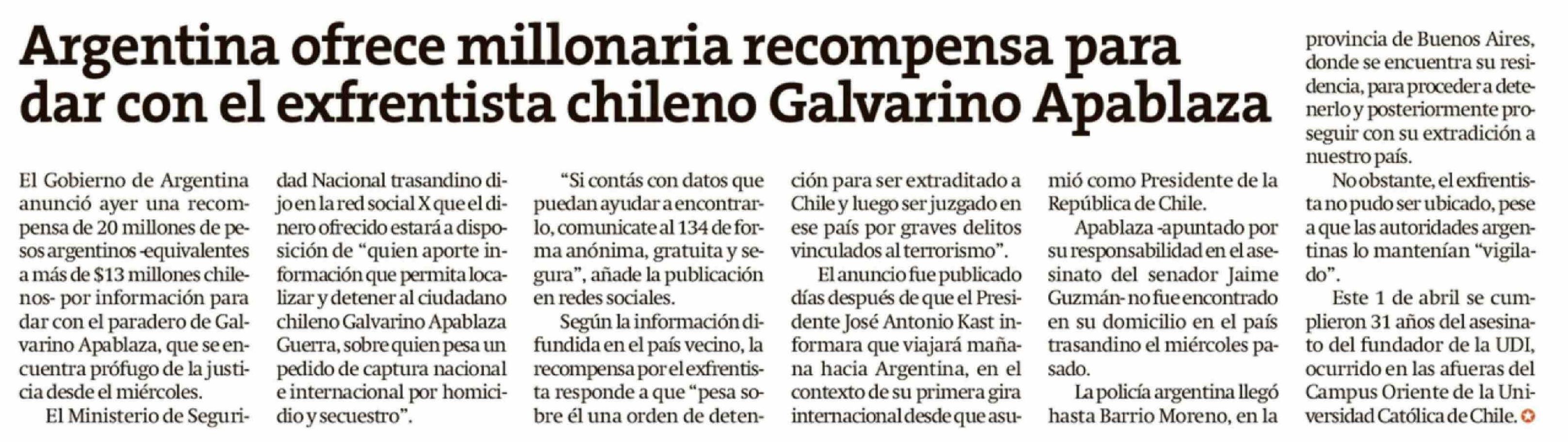 Argentina ofrece millonaria recompensa para dar con el exfrentista chileno Galvarino Apablaza