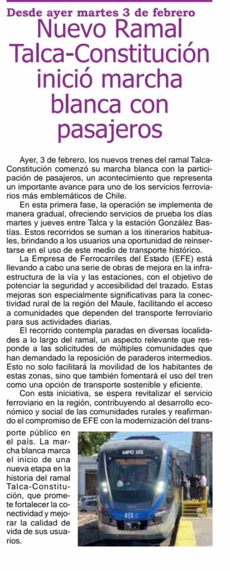 Nuevo Ramal Talca-Constitución inició marcha blanca con pasajeros