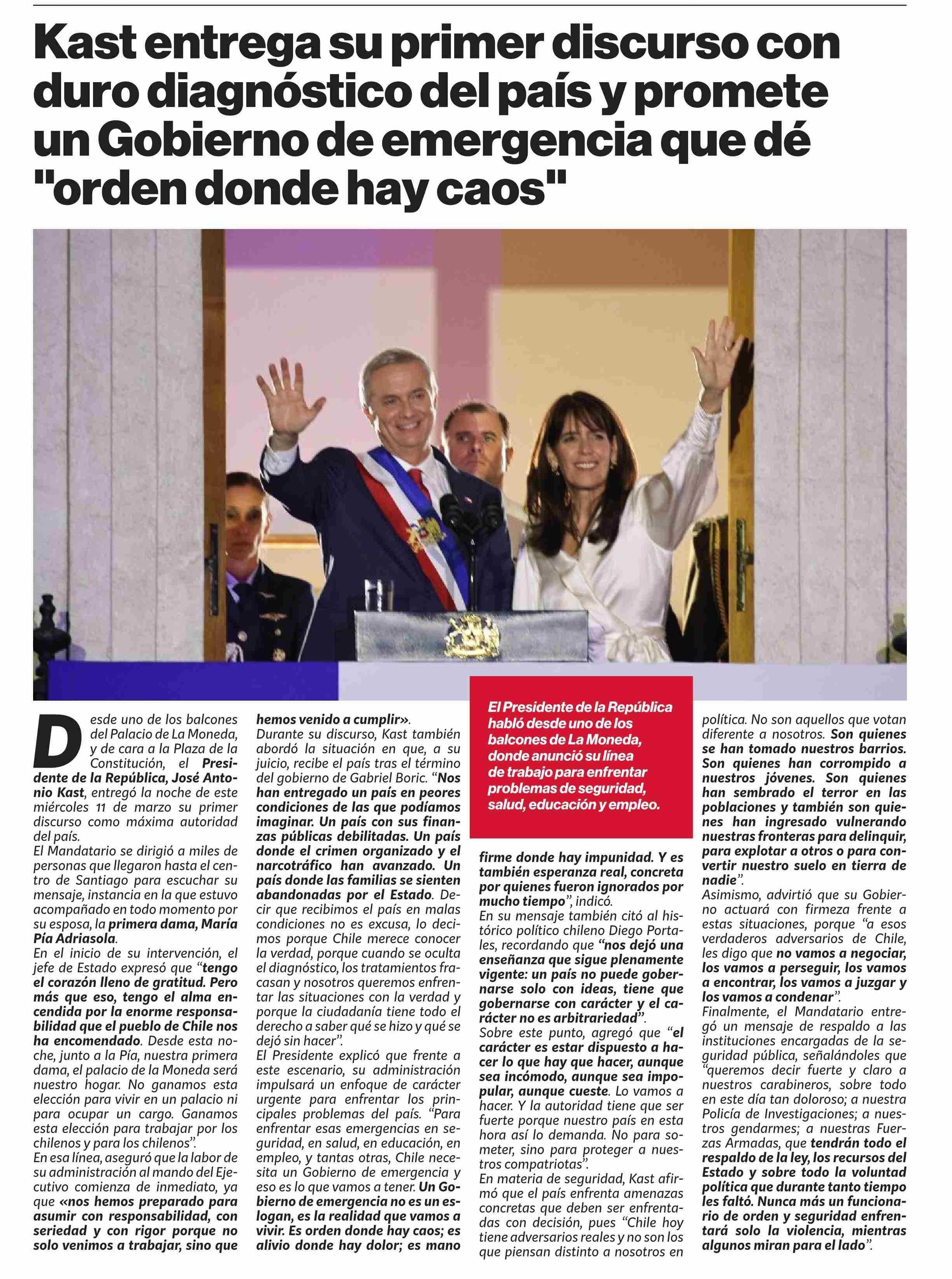 Kast entrega su primer discurso con duro diagnóstico del país y promete un Gobierno de emergencia que dé "orden donde hay caos”