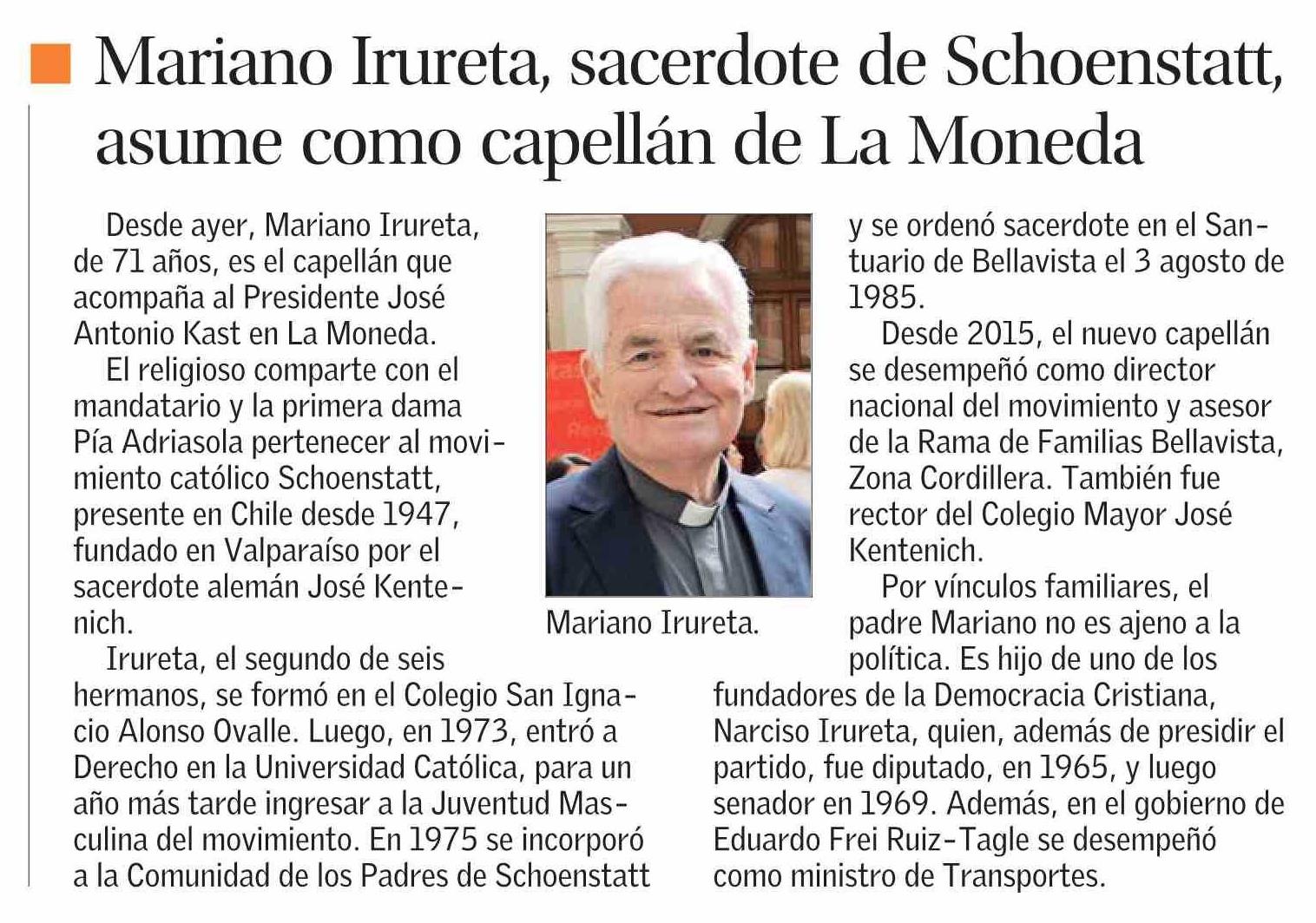 Título: N Mariano Irureta, sacerdote de Schoenstatt, asume como capellán de La Moneda