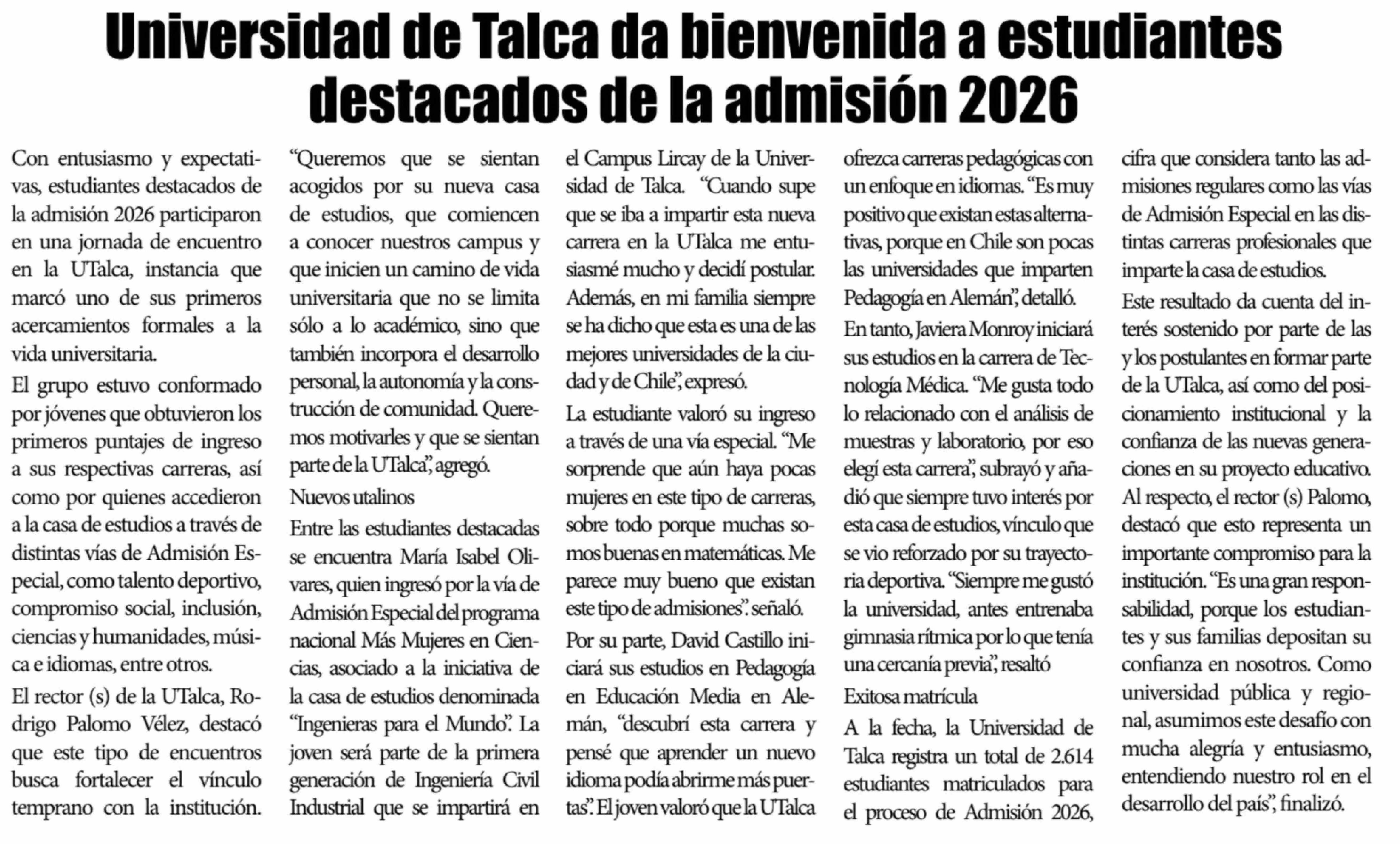Universidad de Talca da bienvenida a estudiantes destacados de la admisión 2026