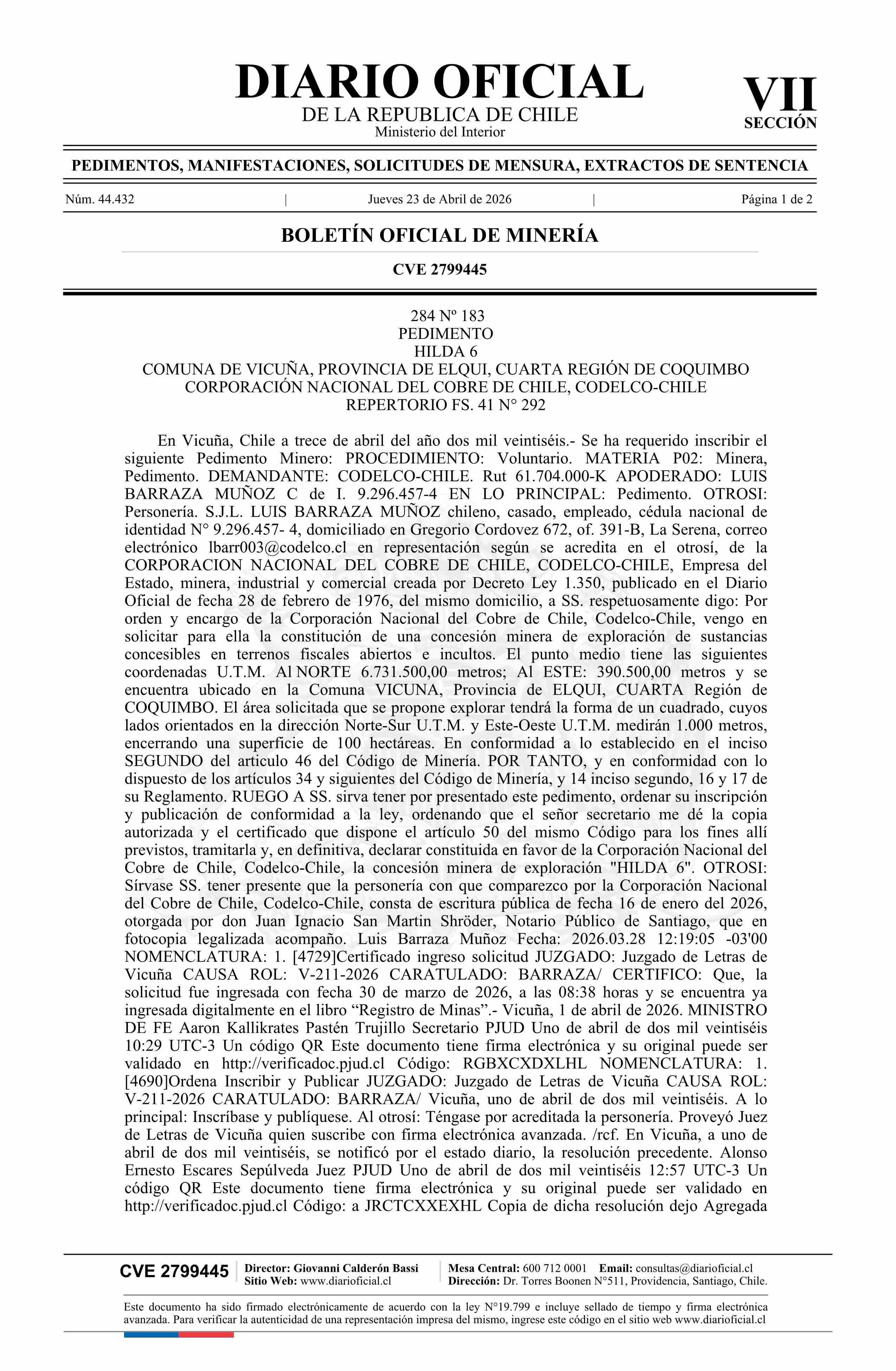 Fuente: DIARIO OFICIAL CHILE - BOLETÍN OFICIAL DE MINERÍA (DIARIO OFICIAL CHILE – BOM – PEDIMENTOS MINEROS) Página(s): 23-24