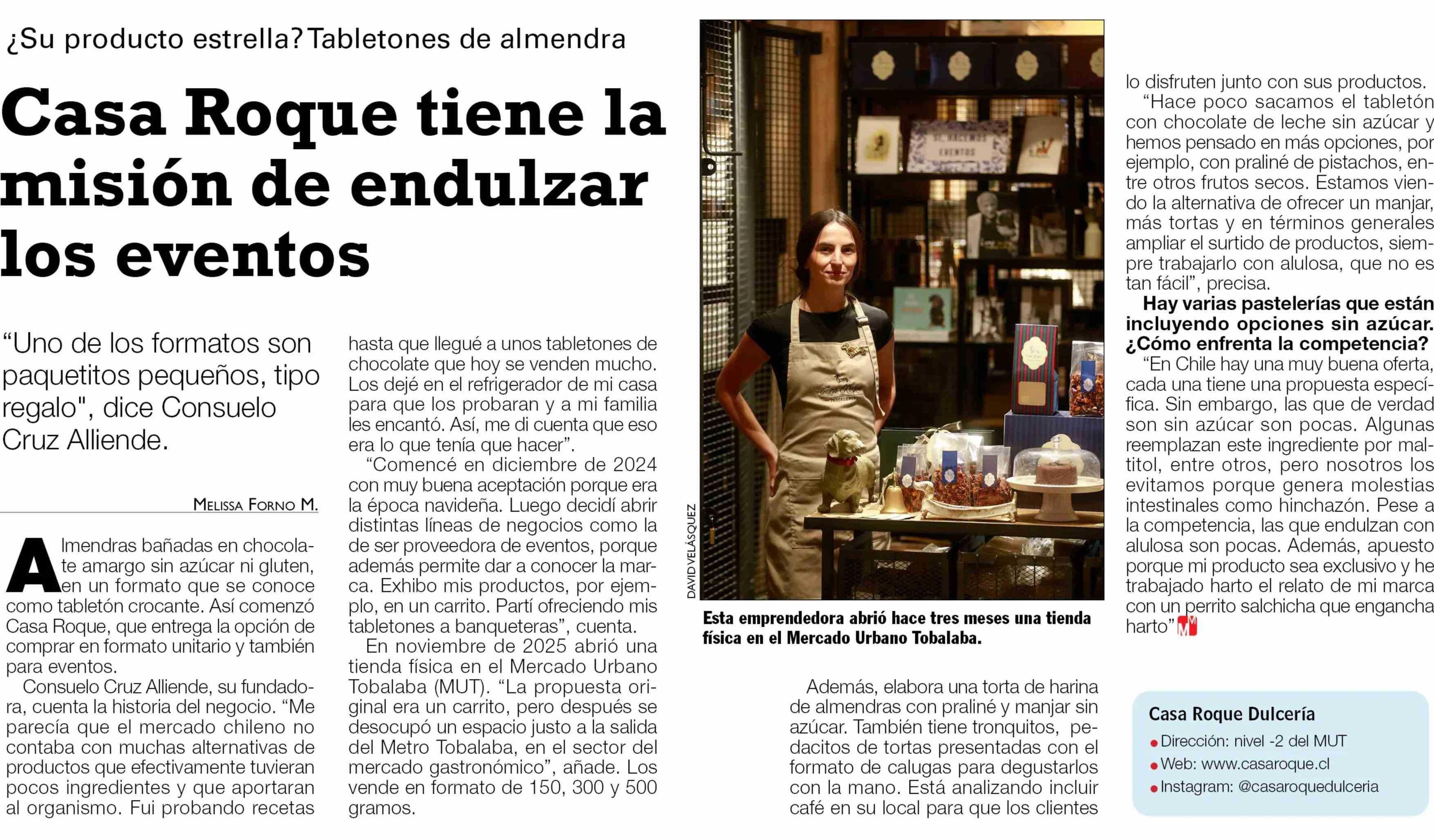 | Título: | Imendras bañadas en chocolate amargo sin azúcar ni gluten, en un formato que se conoce como tabletón crocante. Así comenzó Casa Roque, que entrega la opción de comprar en formato unitario y también para eventos. Consuelo Cruz Alliende, su fundadora, cuenta la historia del negocio. "Me parecía que el |