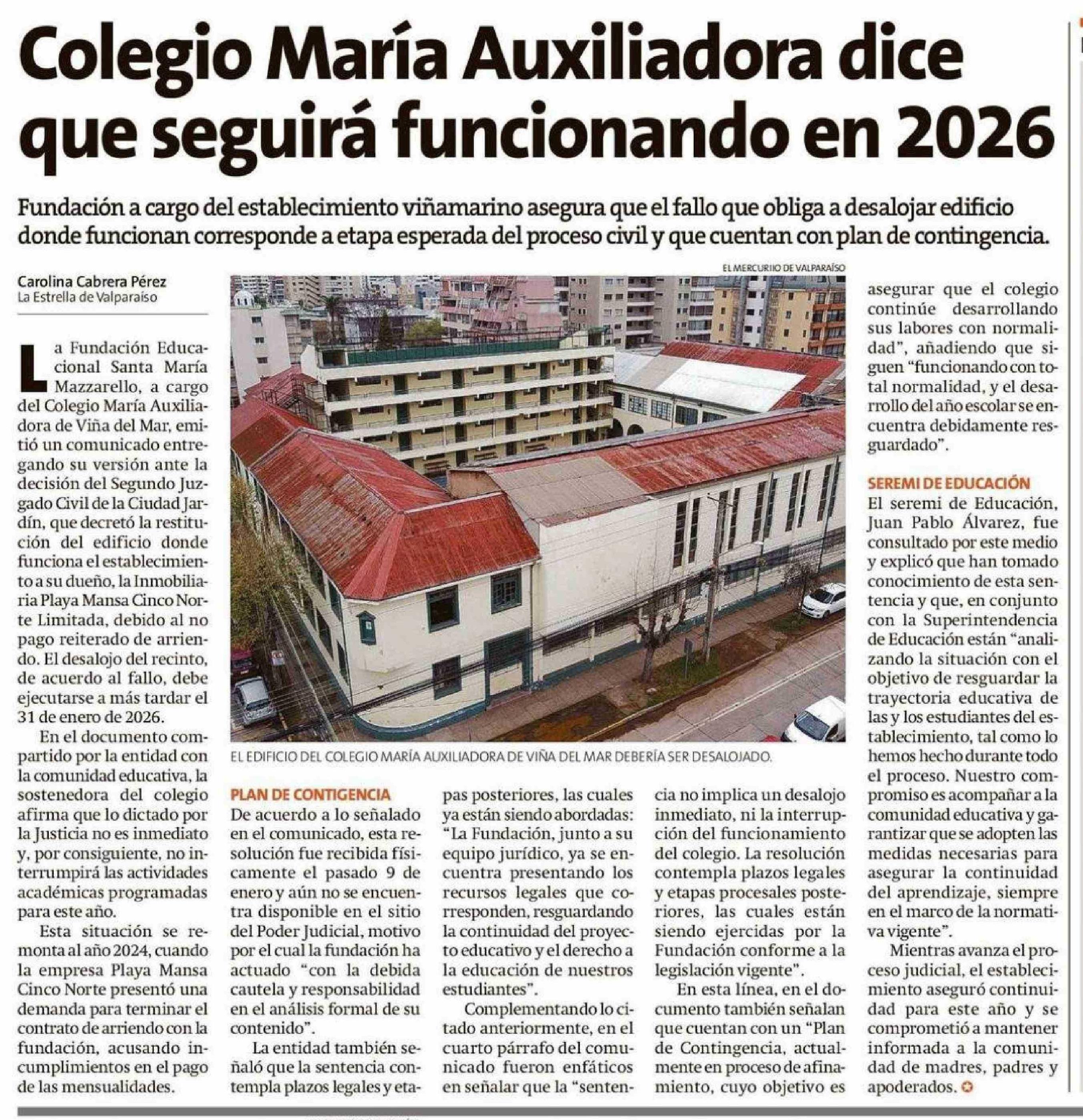 Colegio María Auxiliadora dice que seguirá funcionando en 2026