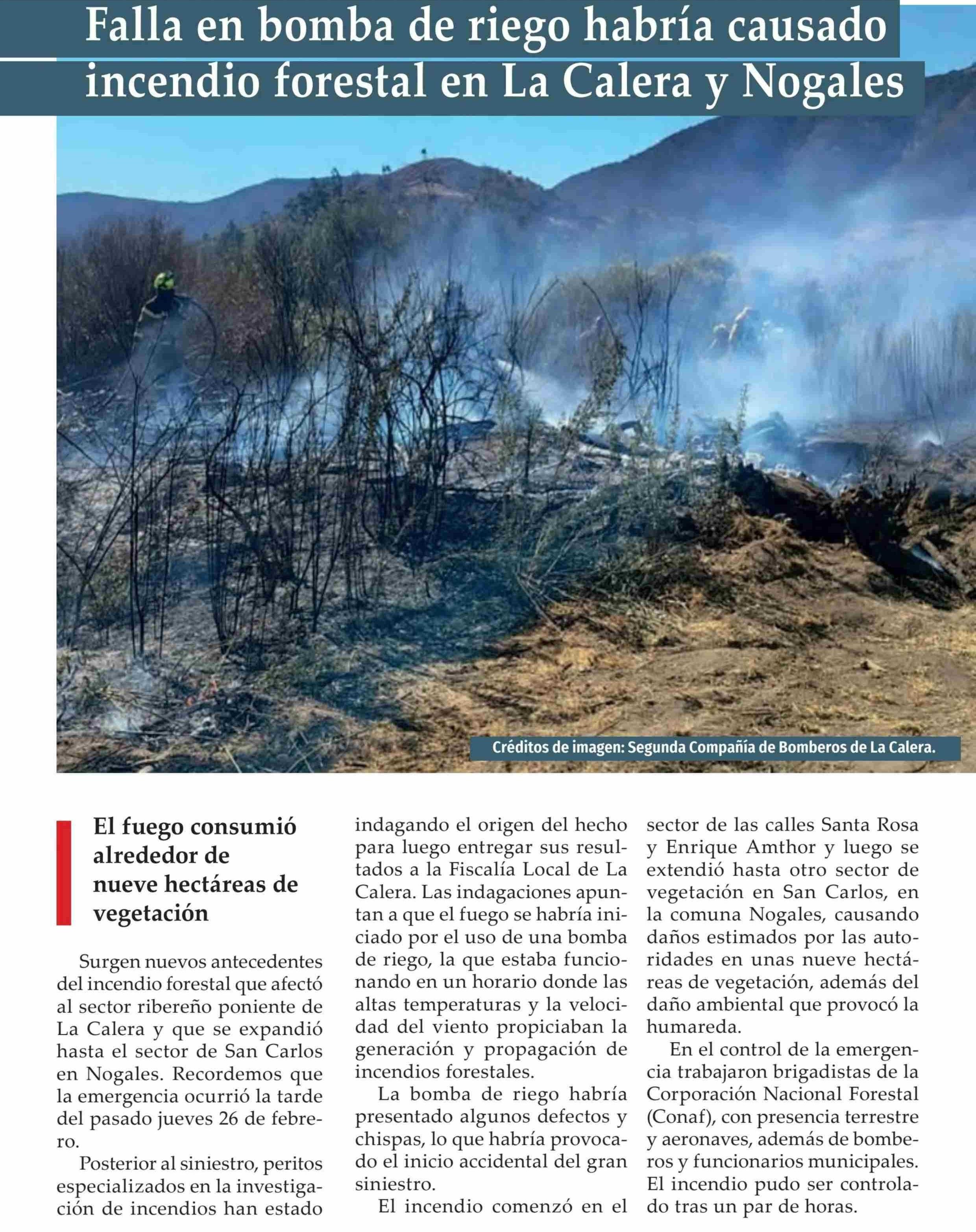 Falla en bomba de riego habría causado ' incendio forestal en La Calera y Nogales