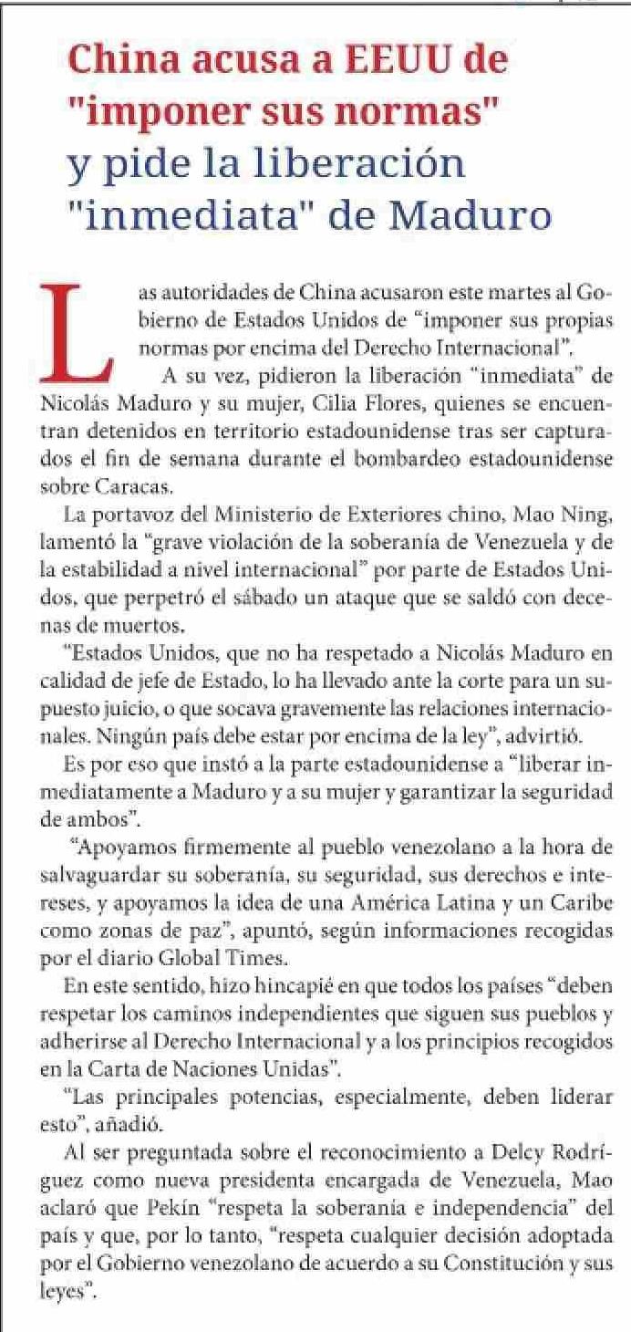 China acusa a EEUU de "imponer sus normas" y pide la liberación "inmediata" de Maduro