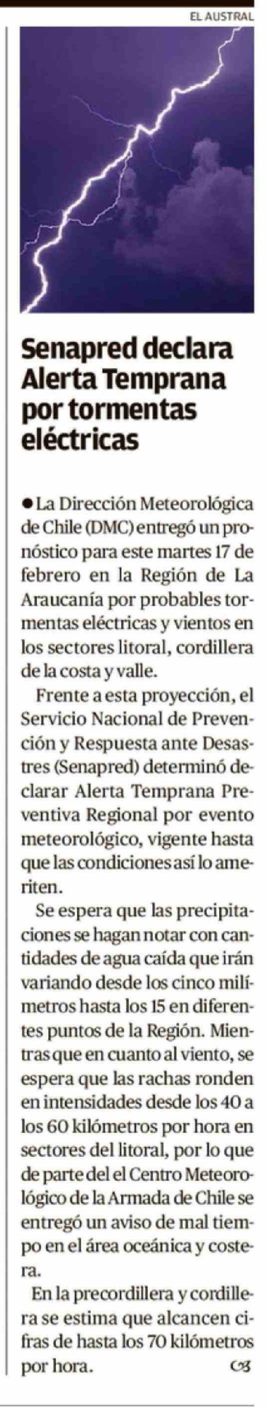 Senapred declara Alerta Temprana por tormentas eléctricas