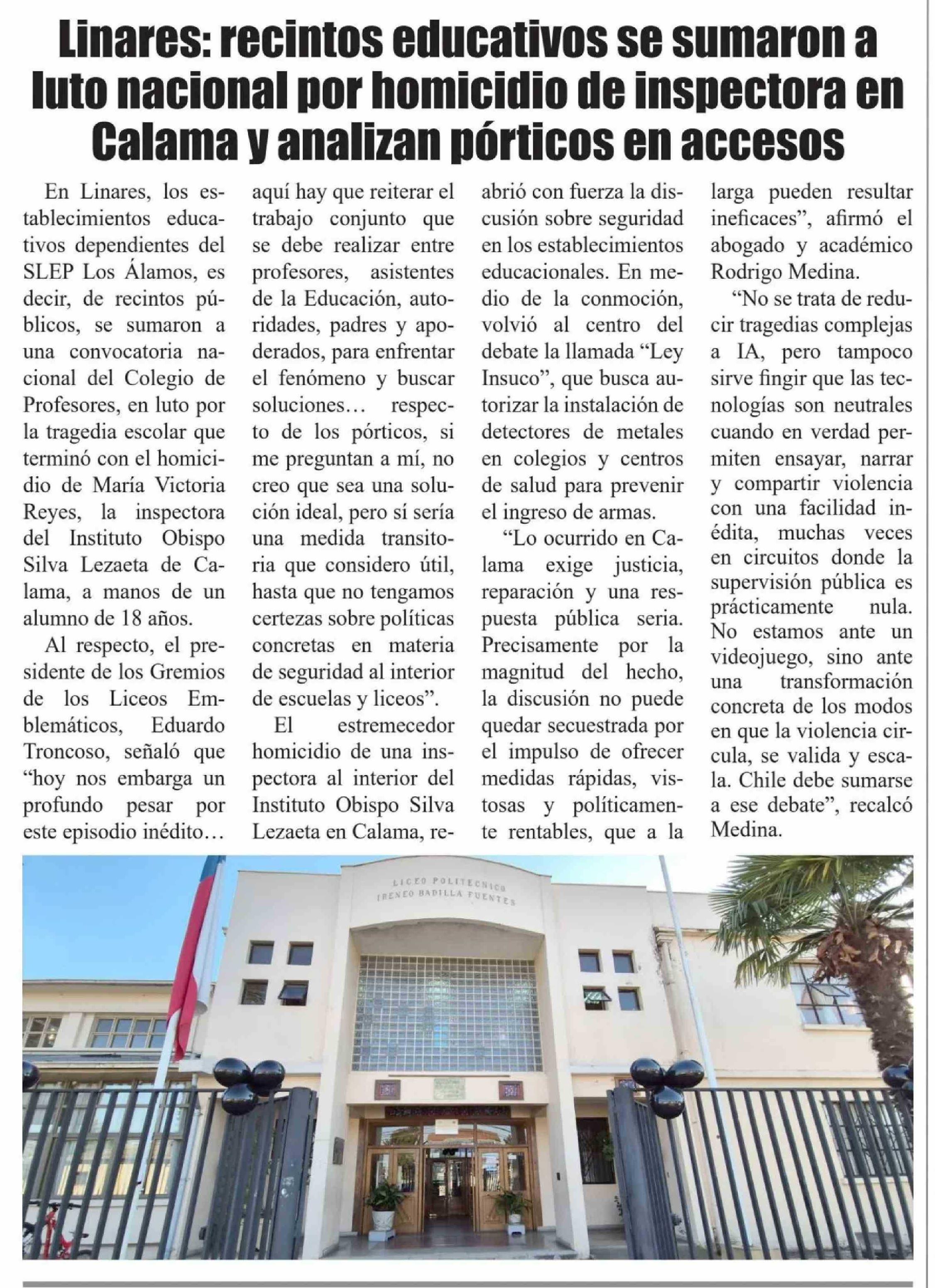 Linares: recintos educativos se sumaron a luto nacional por homicidio de inspectora en Calama y analizan pórticos en accesos