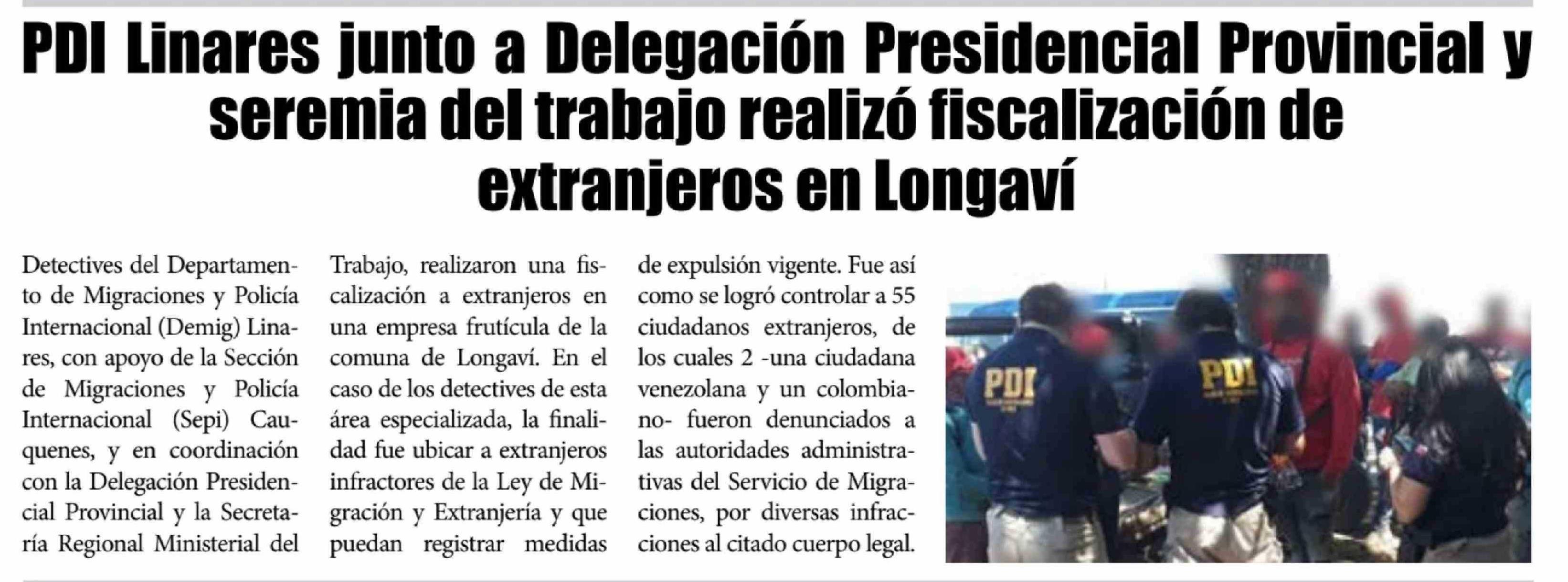 PDI Linares junto a Delegación Presidencial Provincial y seremia del trabajo realizó fiscalización de extranjeros en Longaví