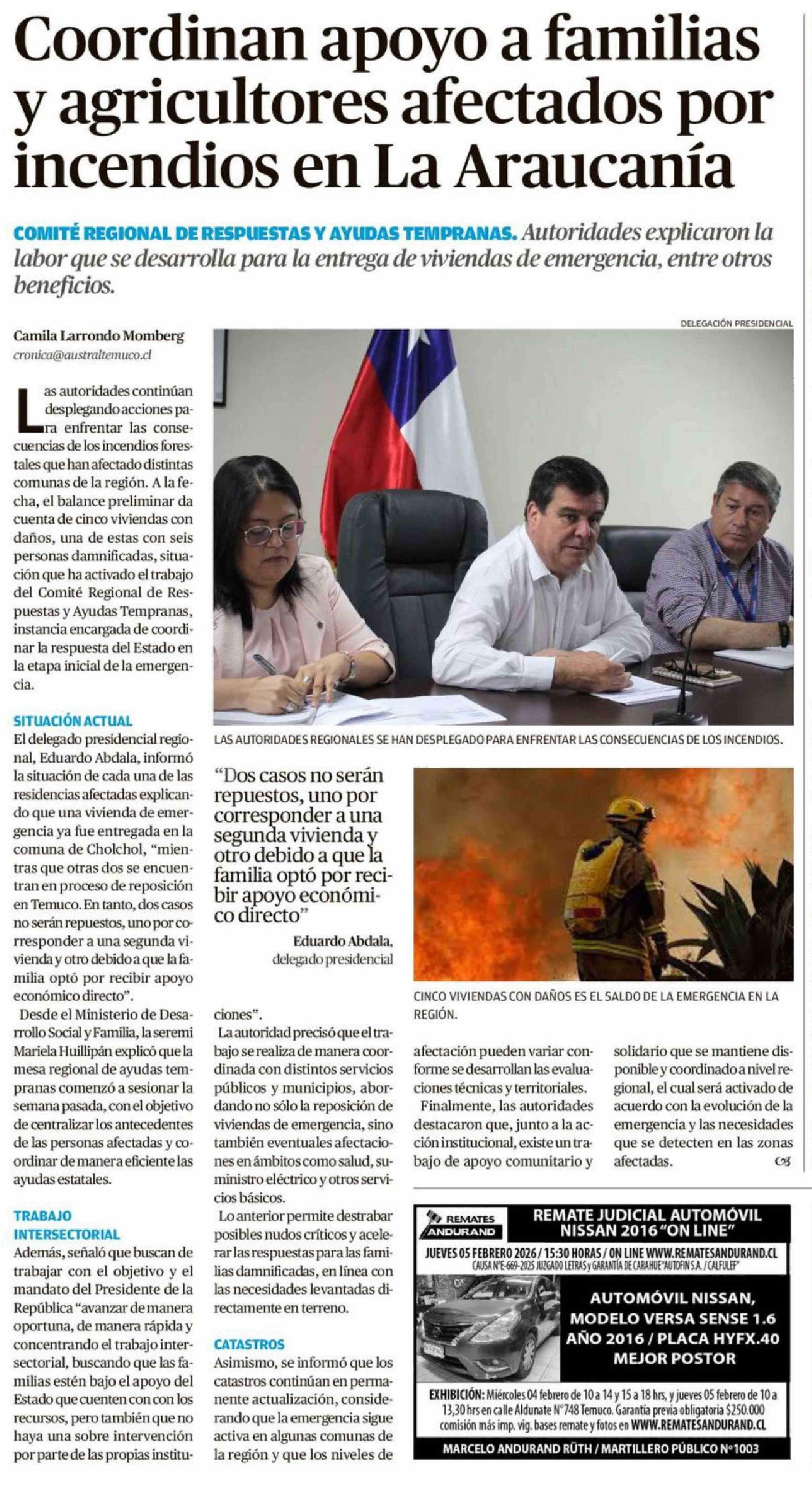 Coordinan apoyo a familias y agricultores afectados por incendios en La Araucanía