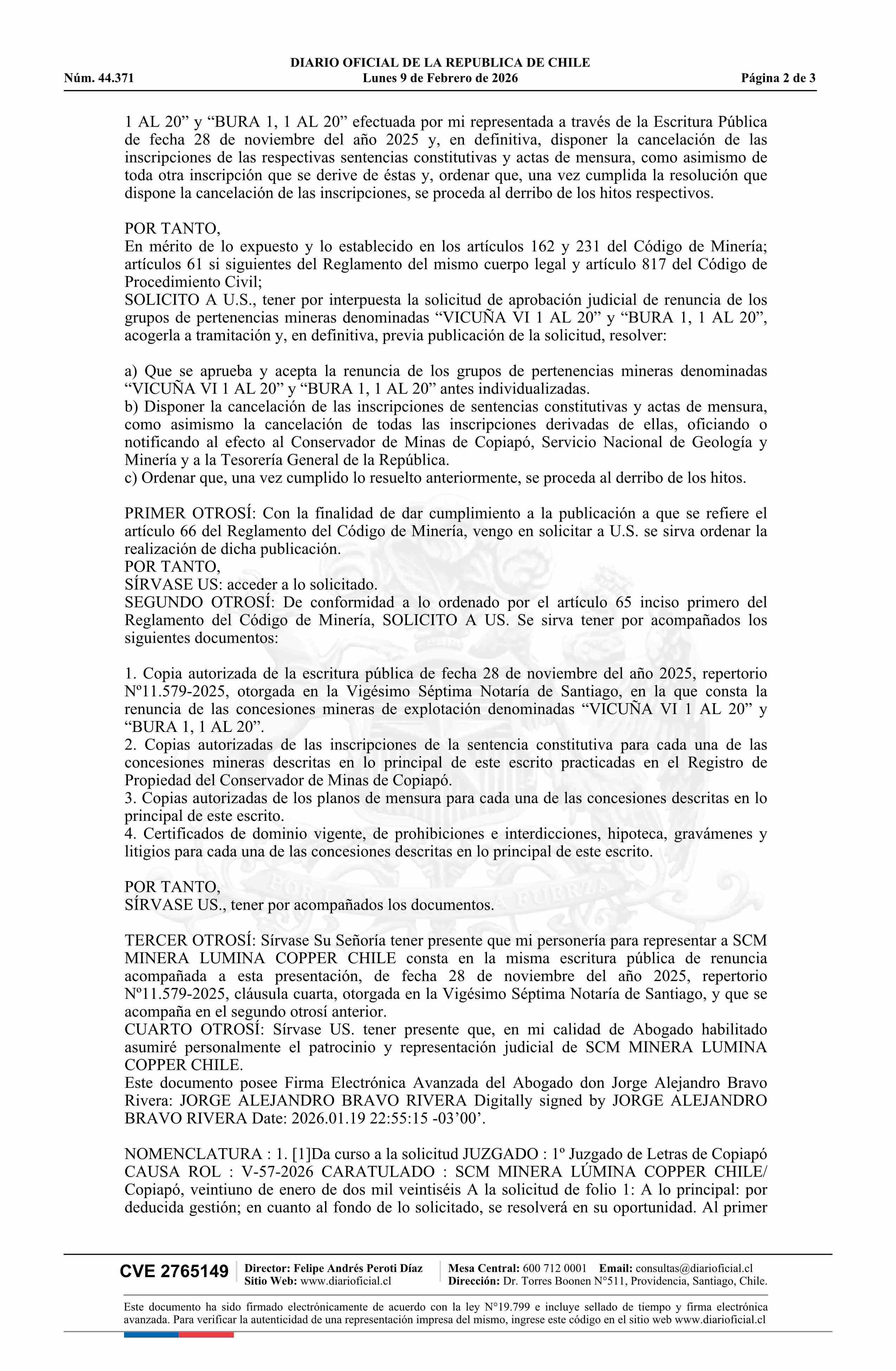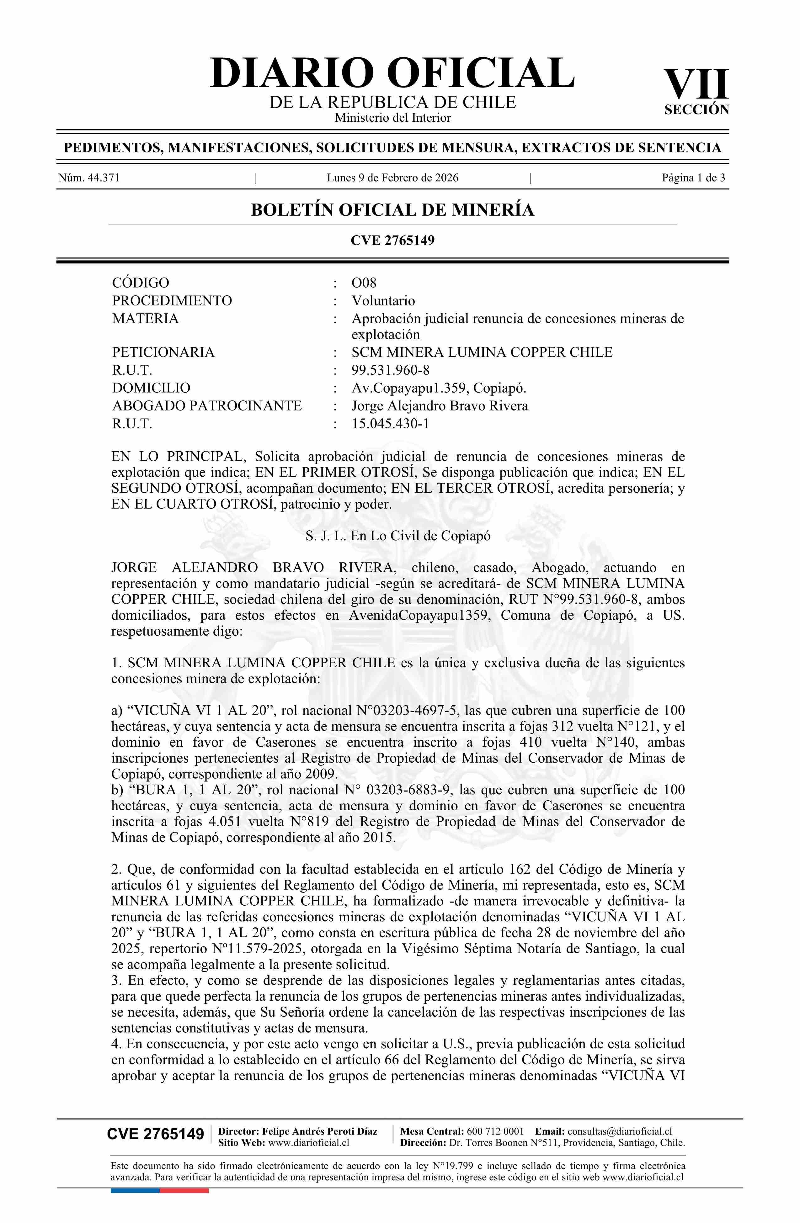 DIARIO OFICIAL CHILE - BOLETÍN OFICIAL DE MINERÍA (DIARIO OFICIAL CHILE – BOM – RENUNCIAS CONCESIÓN)