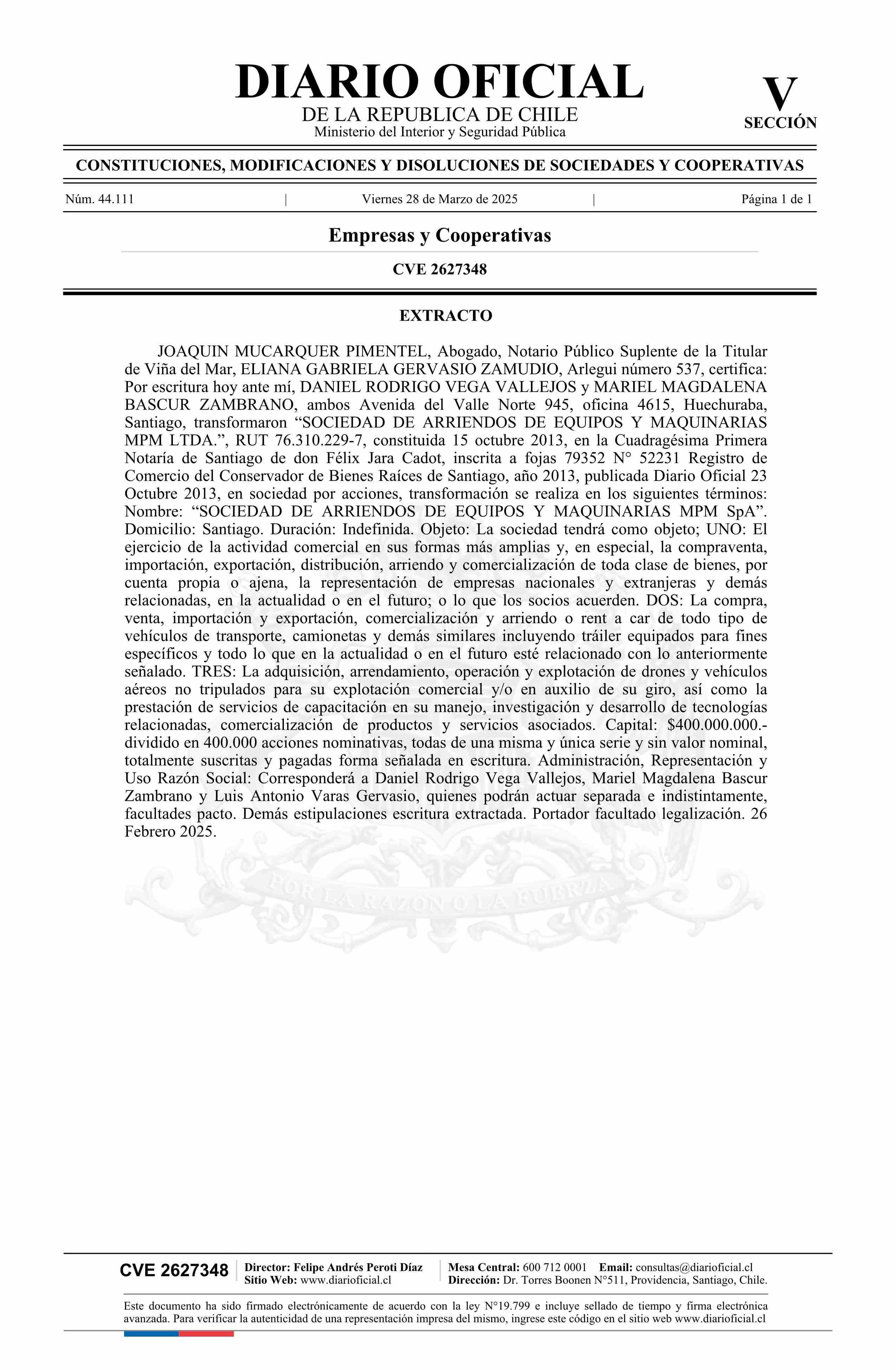 SOCIEDAD DE ARRIENDOS DE EQUIPOS Y MAQUINARIAS MPM LTDA. 76.310.229-7