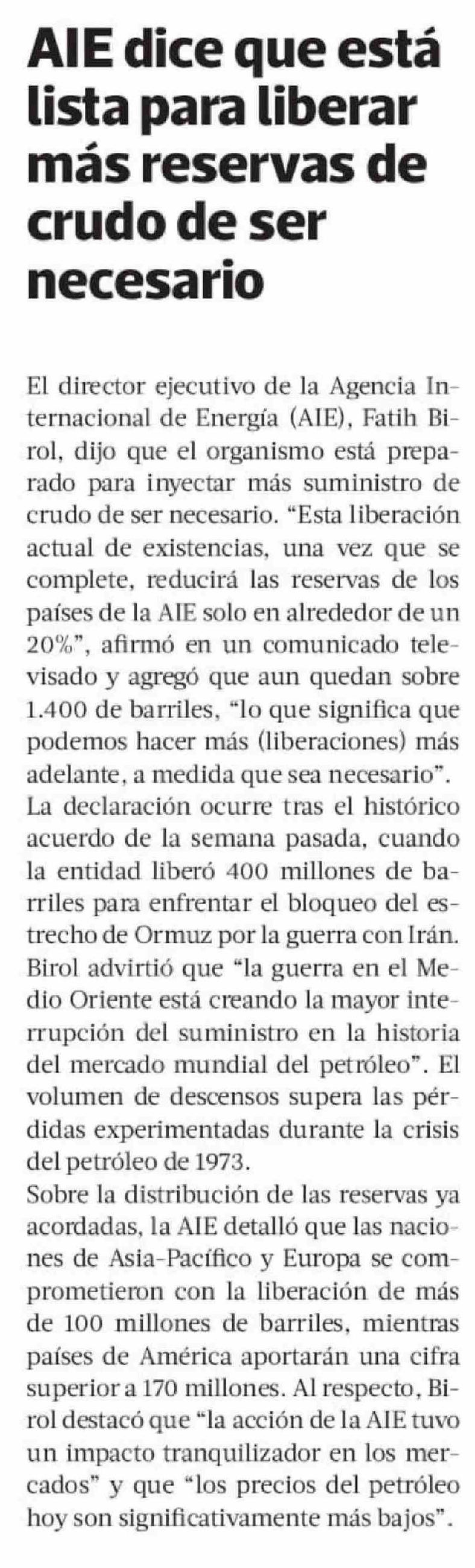 AIE dice que está lista para liberar más reservas de crudo de ser necesario