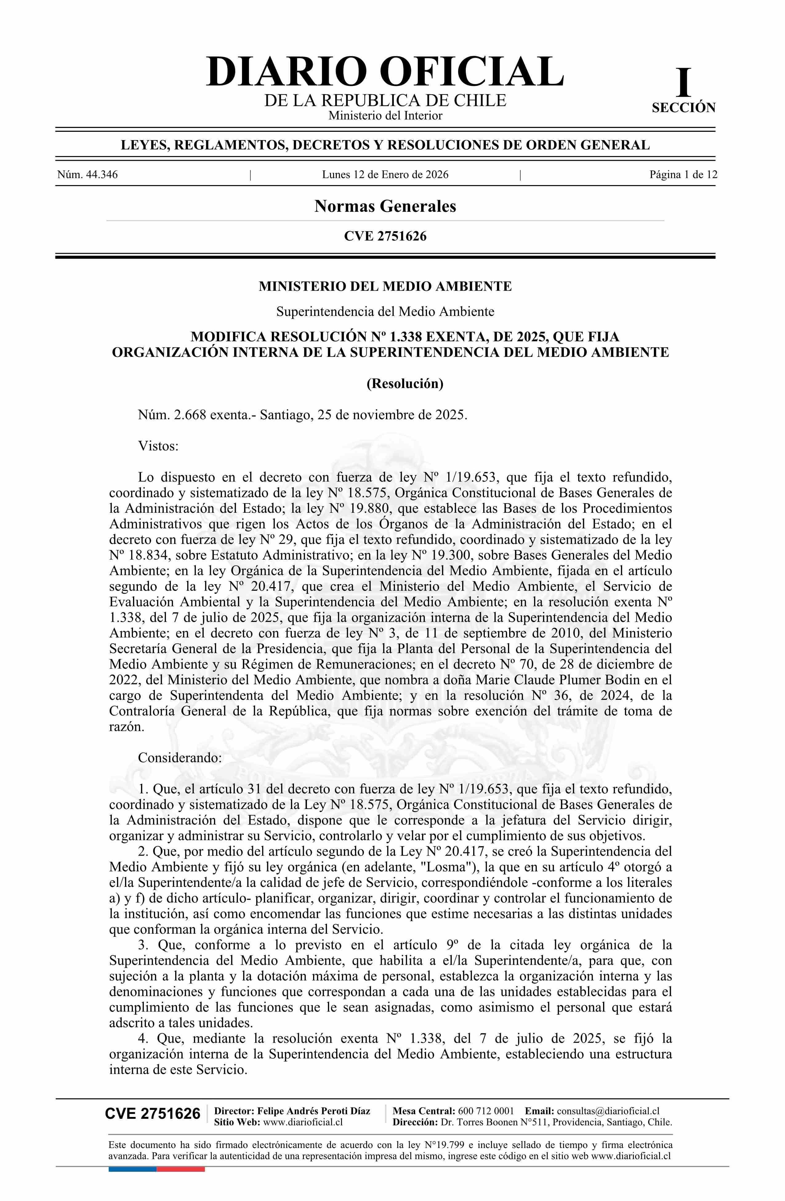 Título: Resolución exenta número 2.668, de 2025.- Modifica resolución Nº 1.338 exenta, de 2025, que fija organización interna de la Superintendencia del Medio Ambiente