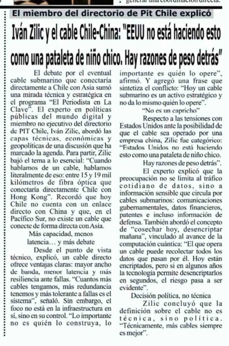 Iván Zilic y el cable Chile-China: "EEUU no está haciendo esto como una pataleta de niño chico. Hay razones de peso detrás"