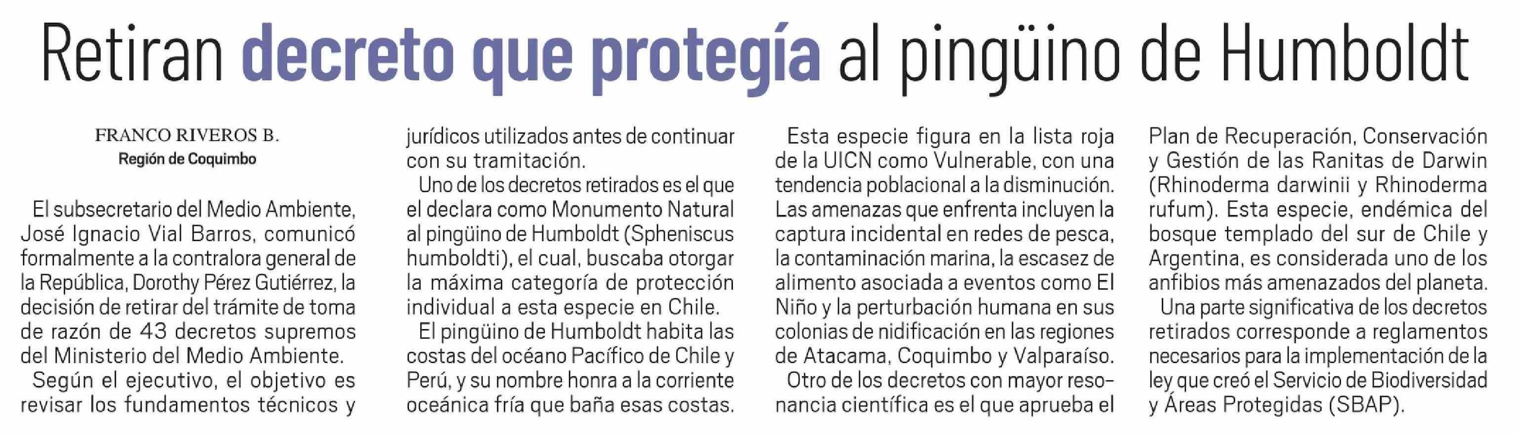 Retiran decreto que protegía al pingüino de Humboldt