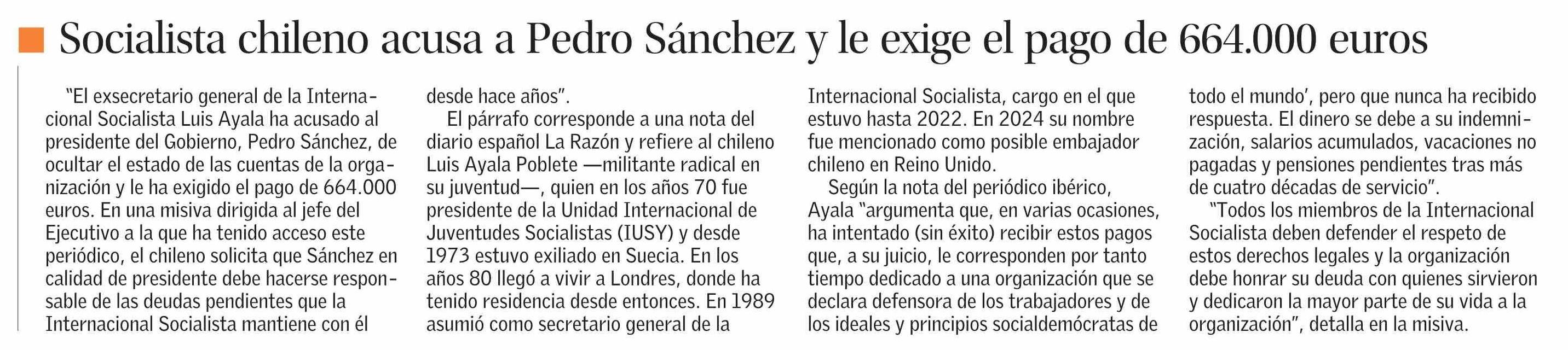 N Socialista chileno acusa a Pedro Sánchez y le exige el pago de 664.000 euros