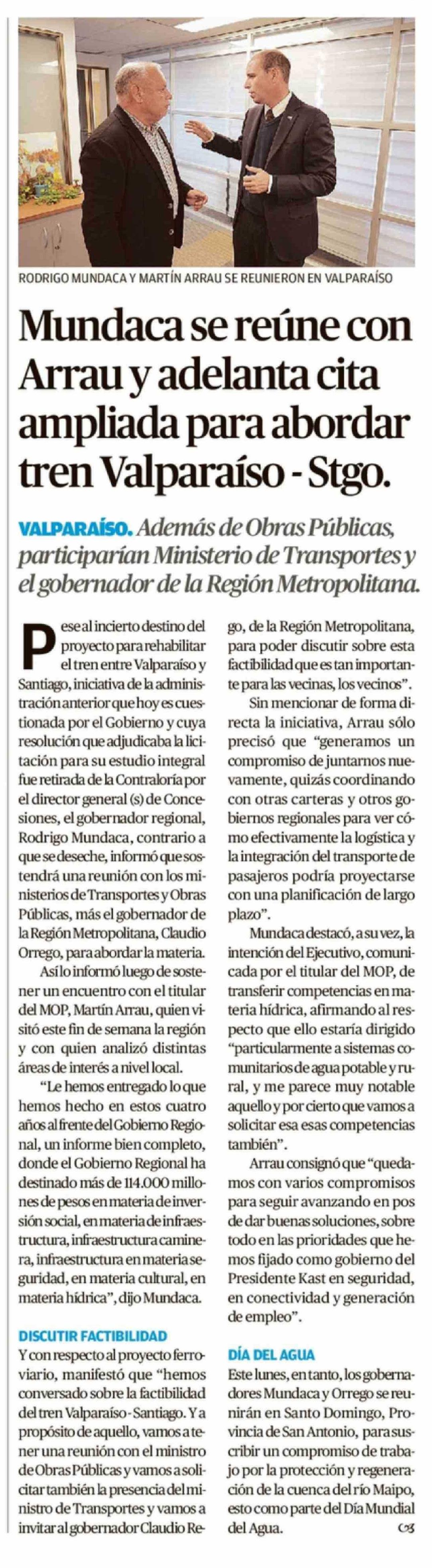 Mundaca se reúne con Arrau y adelanta cita ampliada para abordar tren Valparaíso - Stgo.