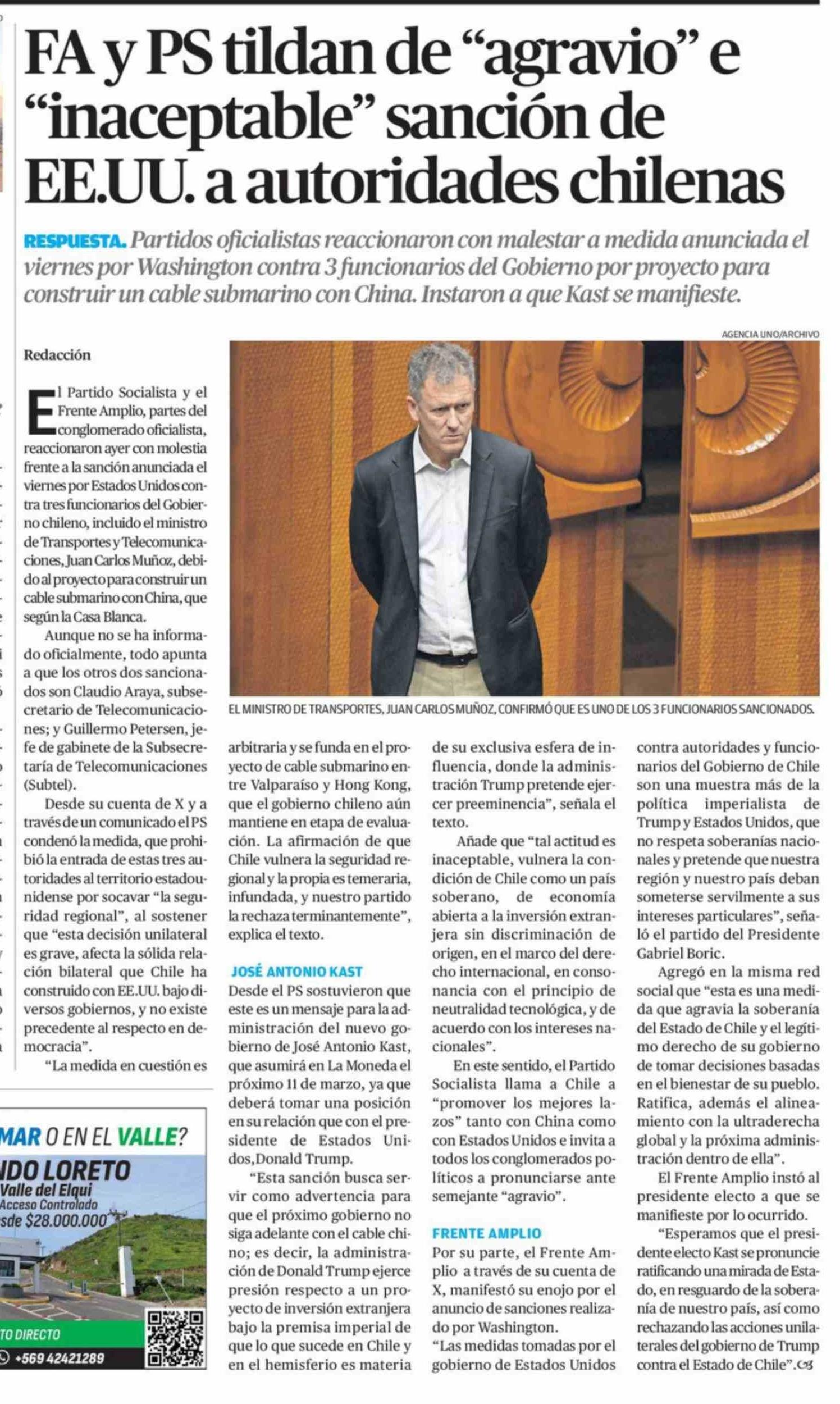 FA y PS tildan de "agravio" e "inaceptable" sanción de EE.UU. a autoridades chilenas