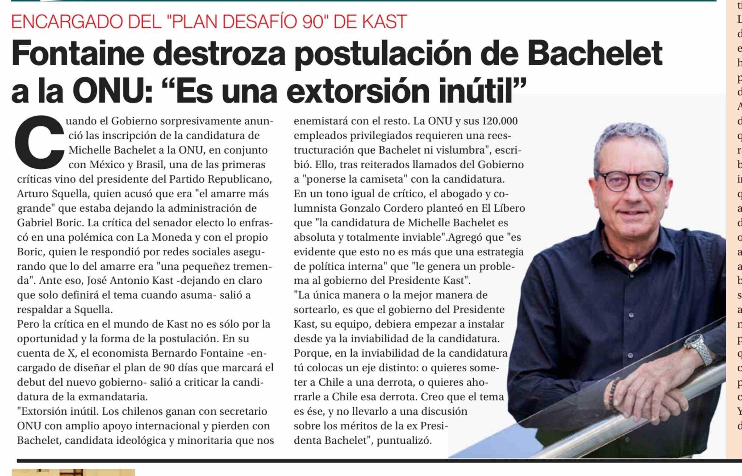Fontaine destroza postulación de Bachelet a la ONU: "Es una extorsión inútil"