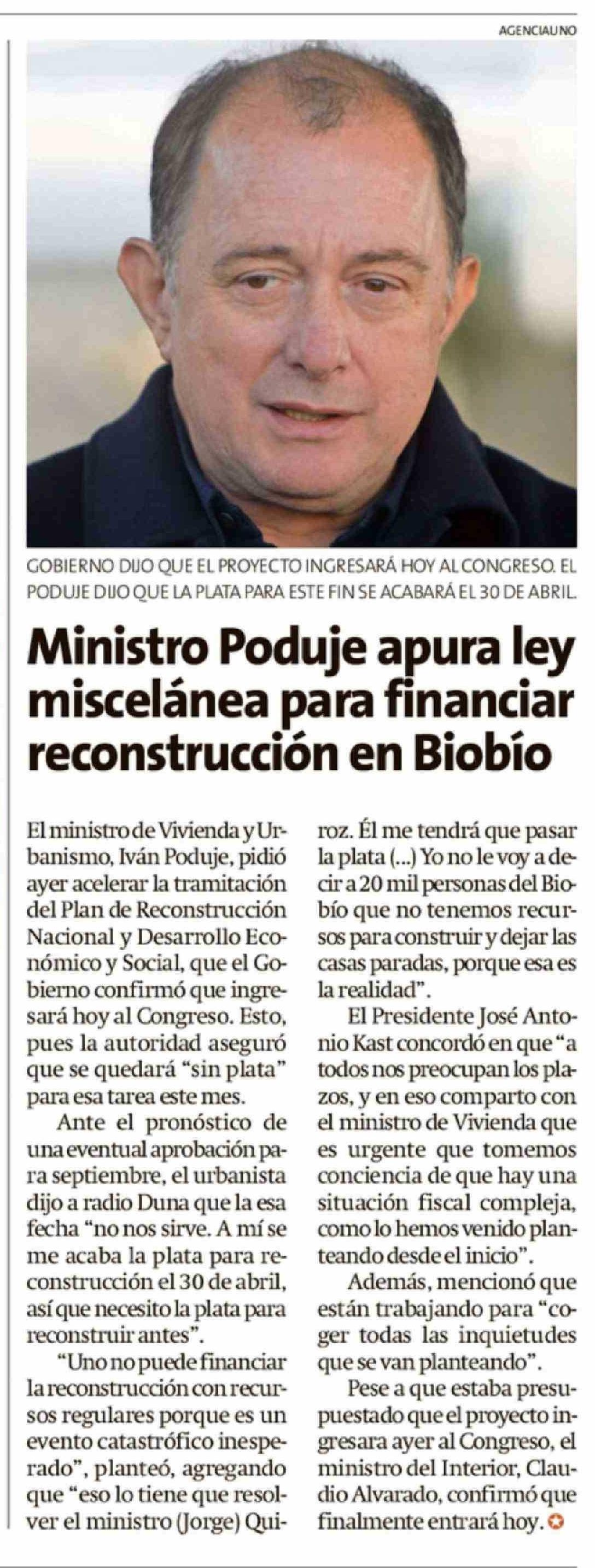 Ministro Poduje apura ley miscelánea para financiar reconstrucción en Biobio