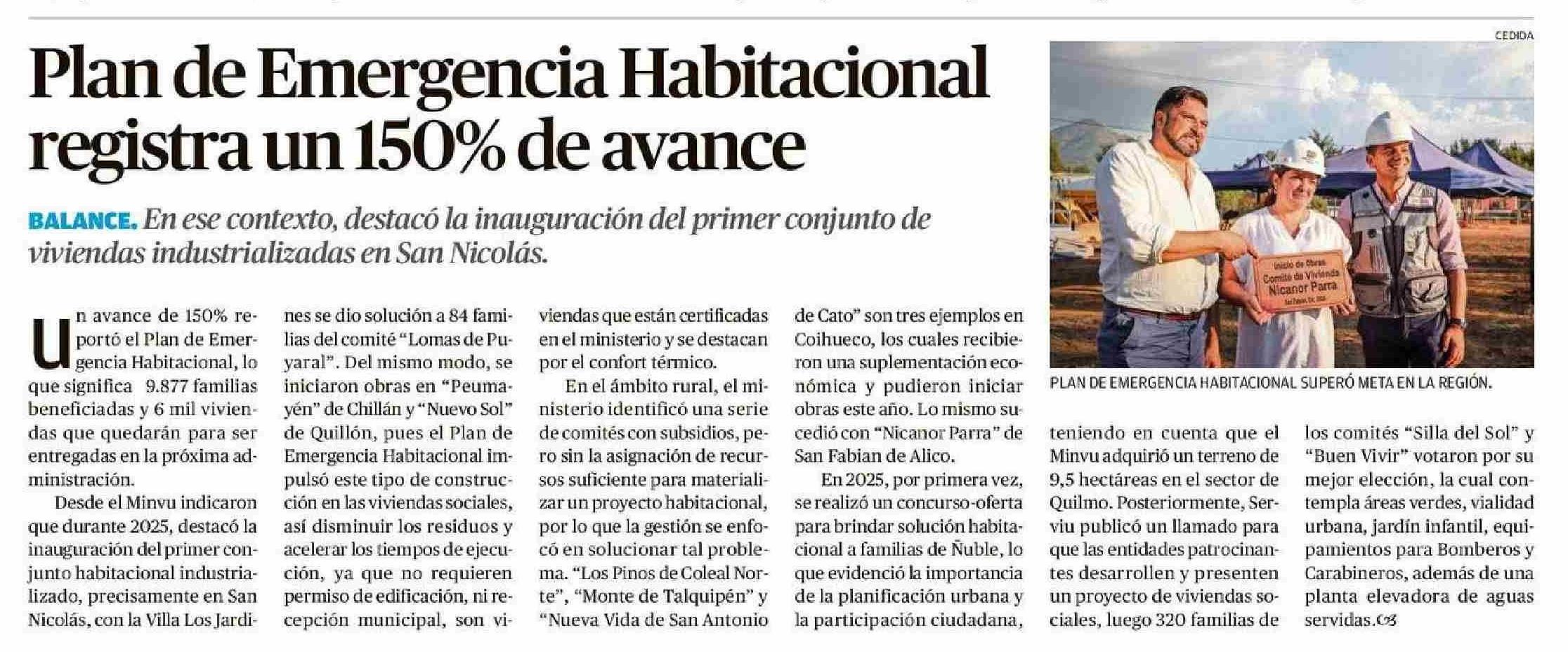 Plan de Emergencia Habitacional registra un 150% de avance