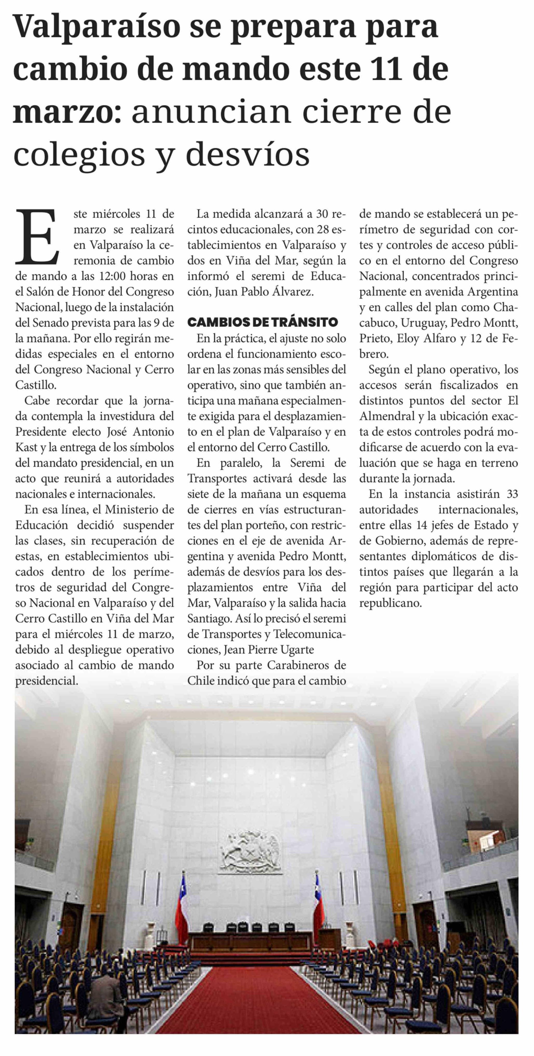 Valparaíso se prepara para cambio de mando este 11 de marzo: anuncian cierre de colegios y desvíos