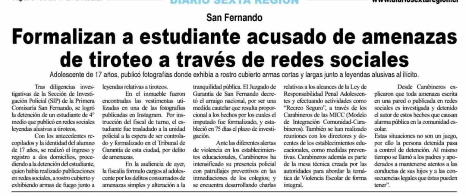 Formalizan a estudiante acusado de amenazas de tiroteo a través de redes sociales