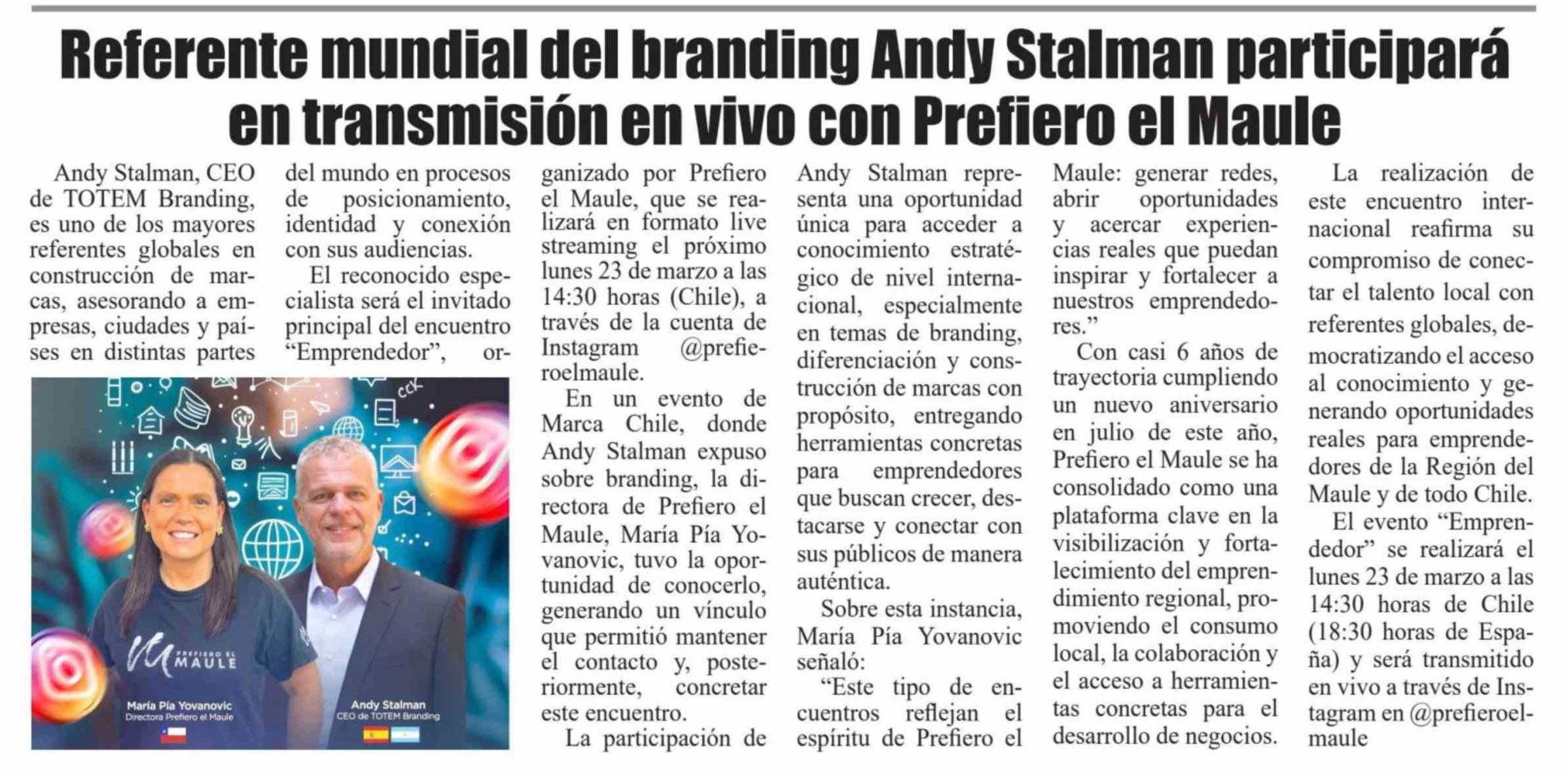 Referente mundial del branding Andy Stalman participará en transmisión en vivo con Prefiero el Maule